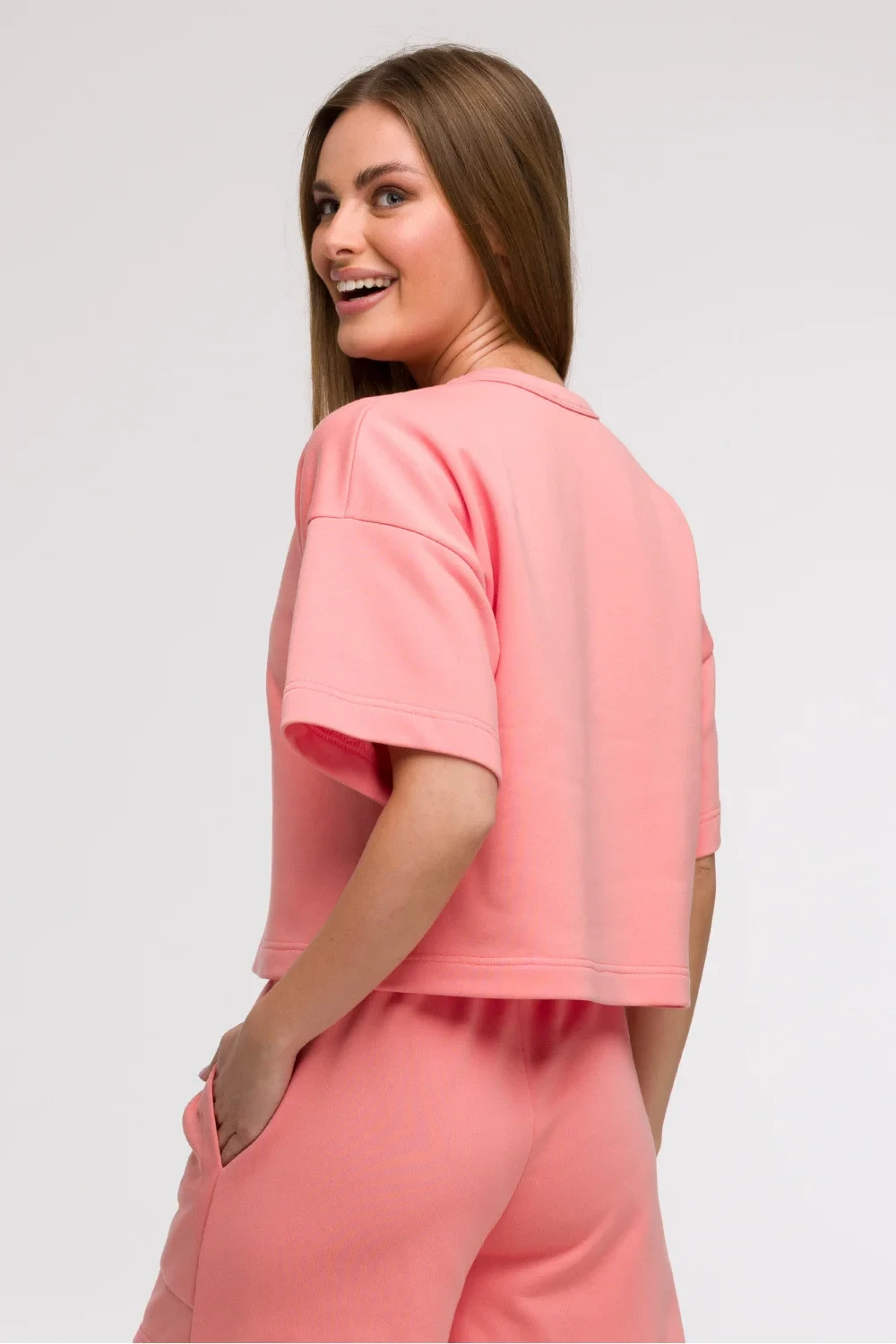 Volný ženský crop top je ideální volbou pro letní každodenní stylizace. Jeho jednoduchý, šatový střih a délka sahající ke kolenům se skvěle kombinuje se šortkami, sukněmi nebo kalhotami s vysokým pasem. Krátký, široký rukáv a absence podšívky zajistí prodyšnost a pohodlí při nošení v teplých dnech. Crop top má klasický, kulatý výstřih pod krkem, který dodává minimalistický charakter. Navržen a ušit v Polsku s důrazem na detaily, představuje spojení pohodlí a stylu. Je skvělou základnou pro dovolenkové i městské outfit.