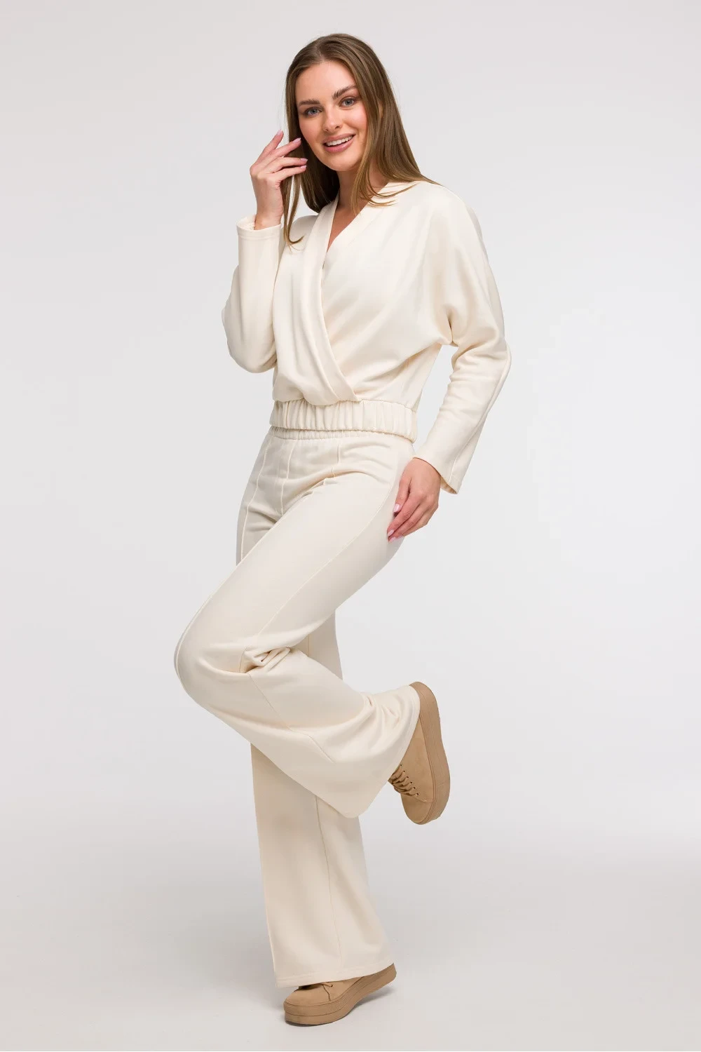 Tato dámská blůza ve stylu wrap je kombinací pohodlí a elegance, která se skvěle hodí jak do každodenního nošení, tak i na dovolené. Vyrobená v Polsku s důrazem na detaily, vyniká předním zapínáním ve tvaru písmene V, které jemně zdůrazňuje výstřih a dodává lehkost celé siluetě. Střih je volný v ramenou a hrudníku, a díky elastickému pasu v pase se blůza harmonicky přizpůsobí tělu, zdůrazňujíc ženské tvary. Tento střih způsobuje, že model vypadá zvláště dobře na postavách typu hruška, vyvažující poměr mezi horní a dolní částí. Délka po pas a dlouhé rukávy ji dělají funkční a snadno stylizovatelnou, jak ve verzi casual, tak elegantní.