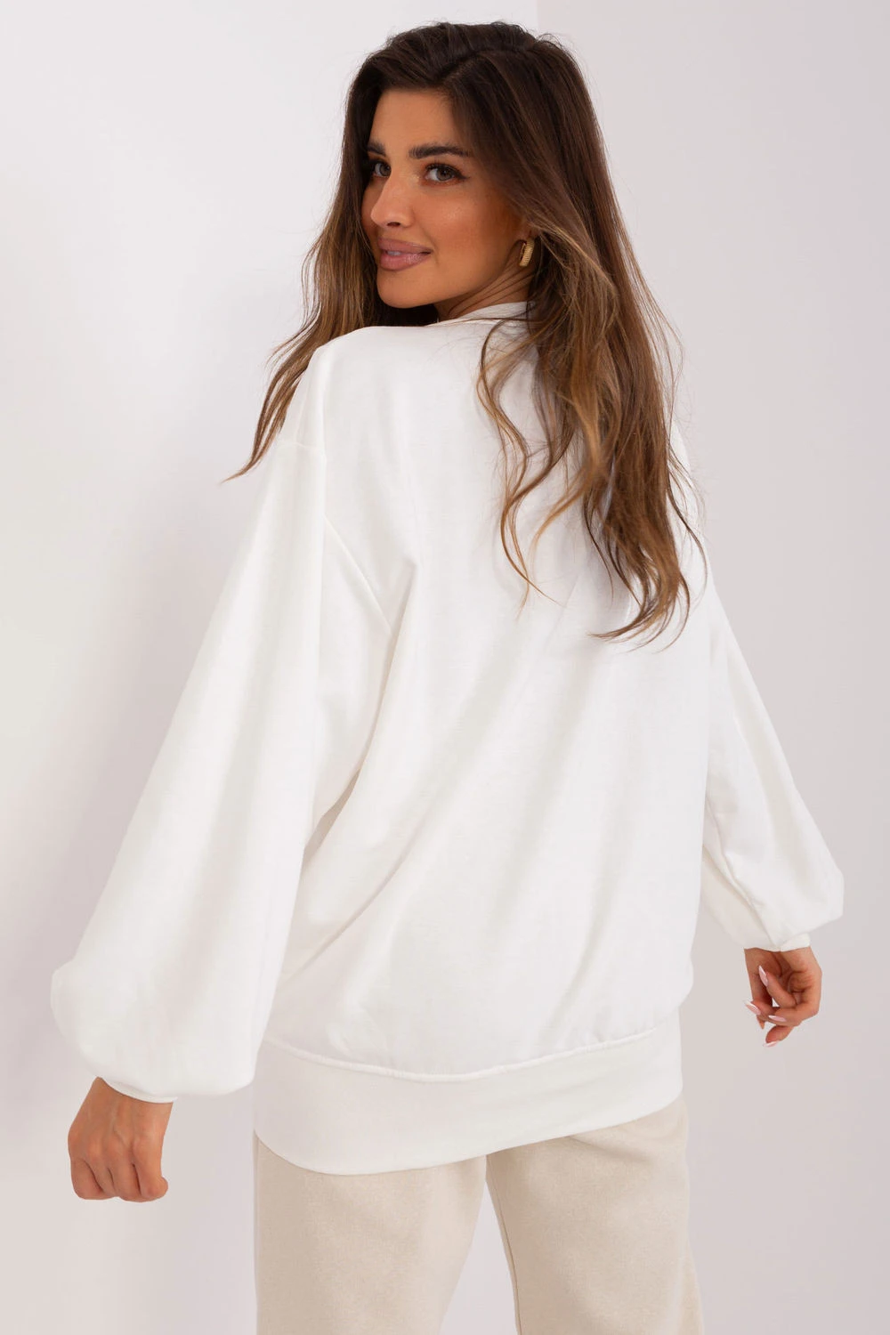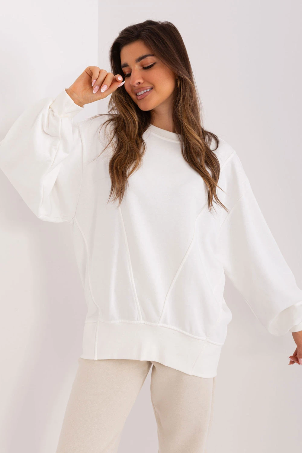 Tato dámská mikina ve stylu casual je ideální kombinací pohodlí a módního designu. Vyrobená z měkké směsi bavlny a polyesteru, poskytuje pohodlí nošení a odolnost. Hladká struktura materiálu dělá mikinu univerzální a snadno stylizovatelnou na každý den. Volný, oversized střih zaručuje volnost pohybu a skvěle padne na postavě, dodávající lehkost a moderní charakter stylizaci. Standardní délka a klasický, kulatý výstřih dělají mikinu vhodnou jak k džínům, tak k teplákovým kalhotám nebo legínám. Na přední straně je decentní ozdobné prošití, které dodává celku jedinečný akcent a odlišuje mikinu od klasických modelů. Je to skvělá volba na každodenní vycházky, relaxaci doma nebo neformální setkání, spojující módní vzhled s maximálním pohodlím.