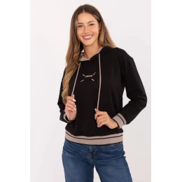 Dámská mikina s ležérním charakterem, vyrobena z převládající směsi bavlny a elastanu, která zaručuje pohodlí a volnost pohybu. Model standardní délky má dlouhé rukávy s kontrastními manžetami, které se opakují i na spodním okraji, dodávají mikině moderní vzhled. Vybavená praktickou kapucí s šňůrkami, skvěle se hodí na každodenní příležitosti. Hladký povrch materiálu je oživený vyšíváním na přední straně, které dodává celku stylový akcent. Mikina nemá zapínání, co zdůrazňuje její uvolněný a pohodlný charakter.