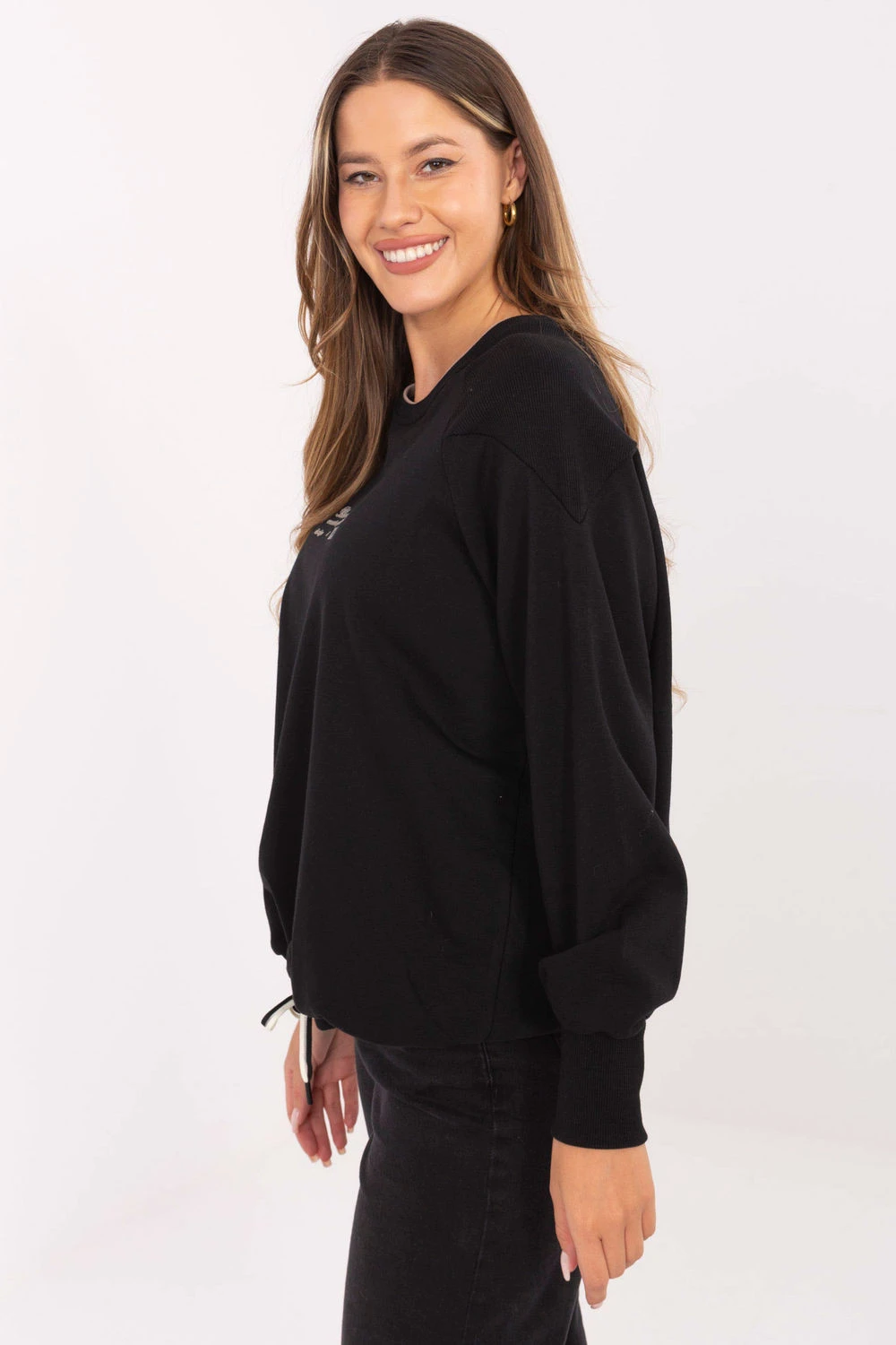 Dámská mikina Casual vyrobena z měkké směsi bavlny a polyesteru, spojující pohodlí s moderním stylem. Klasický kulatý výstřih a dlouhé rukávy s širokými lemy zajistí pohodlí při nošení a standardní délka dělá mikinu skvělým doplňkem jak k kalhotám, tak k sukním. Na přední straně je moderní potisk ve formě nápisů, který dodává celku charakter a šněrování na spodku mikiny umožňuje přizpůsobit střih siluetě a přidat stylový akcent. Ideální na každodenní, ležérní outfit.