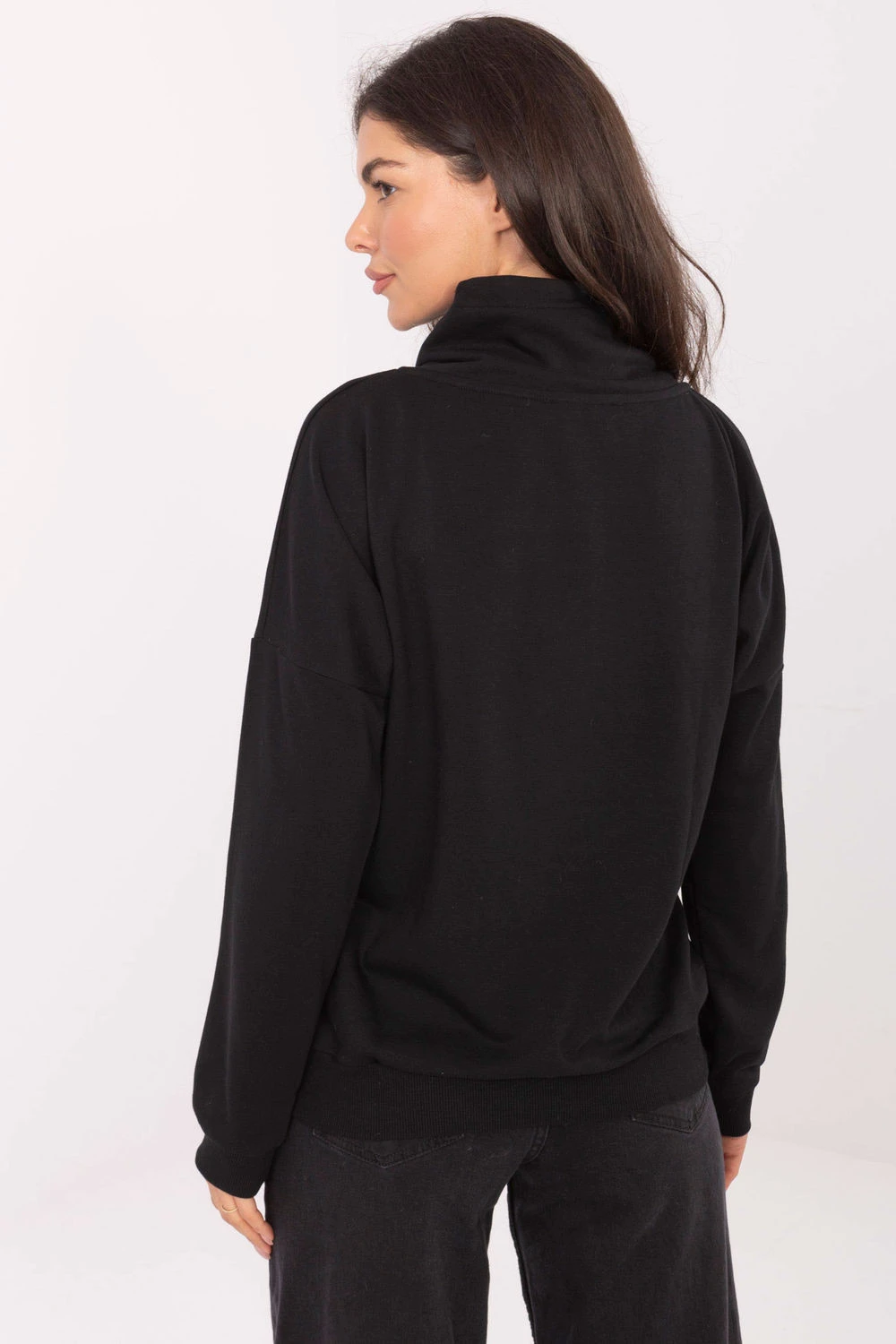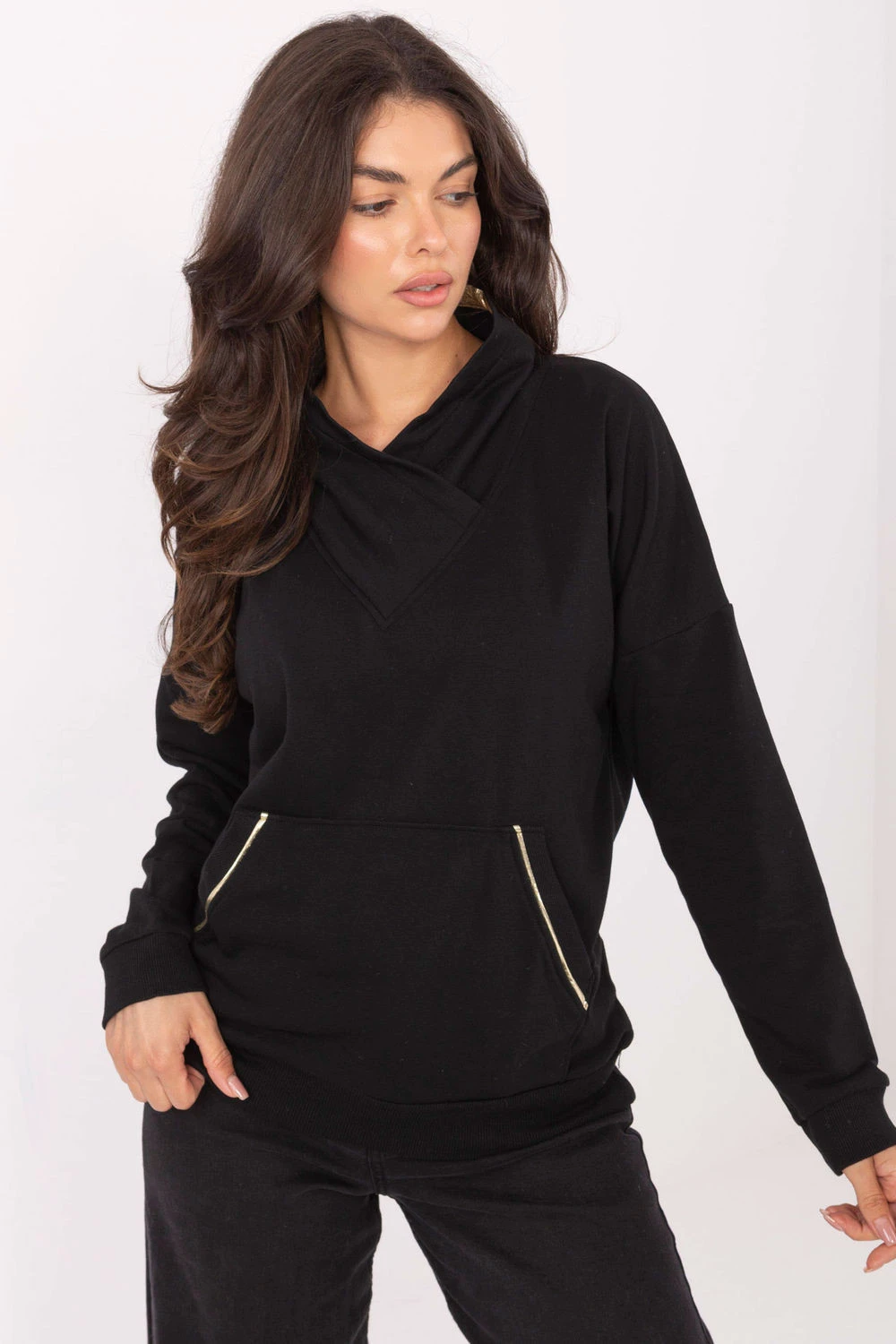 Dámská mikina v casual stylu, ideální na každodenní příležitosti. Vyrobena z měkké a elastické směsi bavlny s elastanem, zaručuje pohodlí a volnost pohybu při zachování trvanlivosti materiálu. Model standardní délky má dlouhý rukáv a otočený límec, který dodává celku jemný charakter. Praktická kapsa typu klokánek dělá mikinu funkční a pohodlnou na nošení. Hladký vzor ji činí univerzálním kouskem šatníku, snadno kombinovatelným s ostatními kousky každodenního oblečení, od tepláků až po džíny.