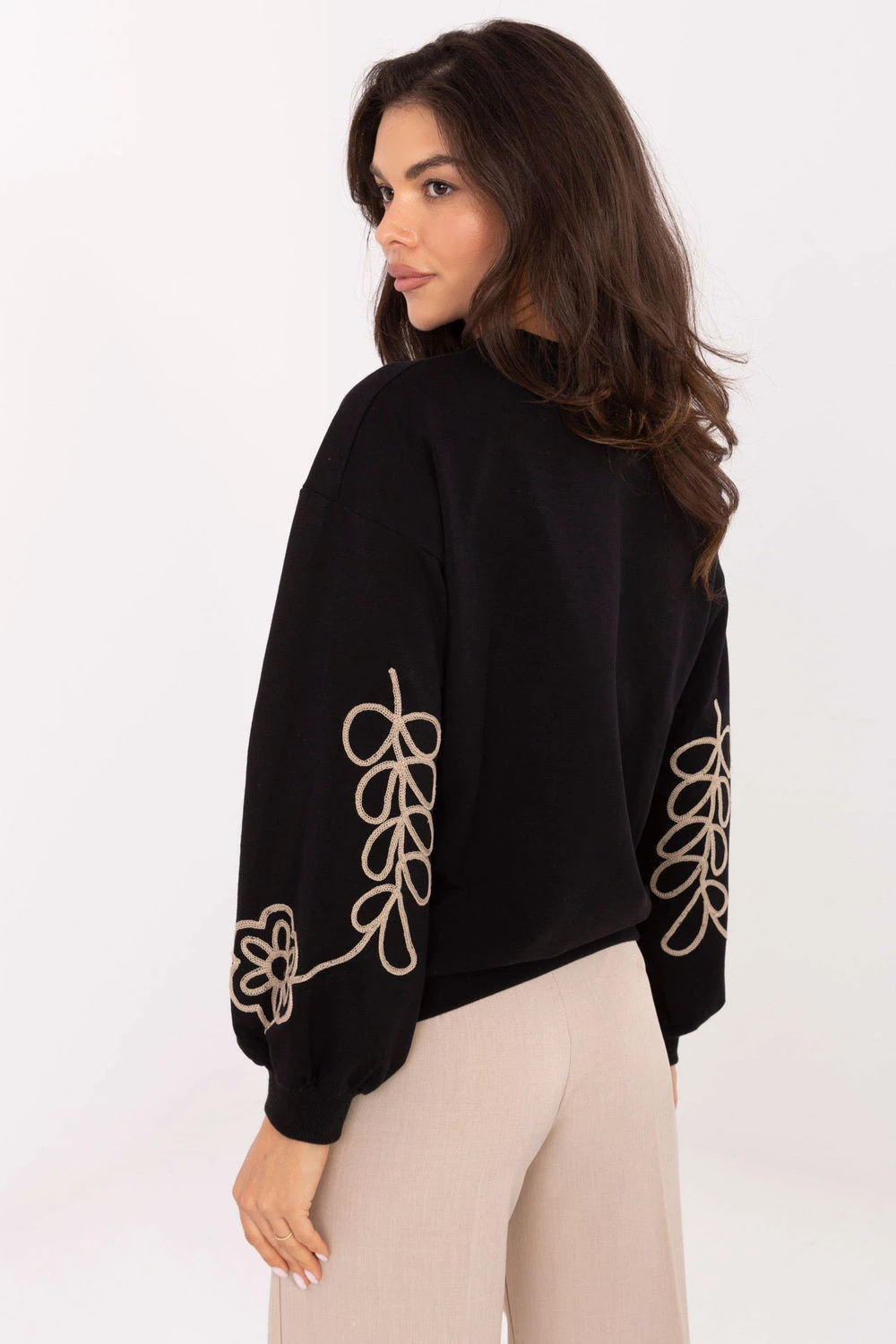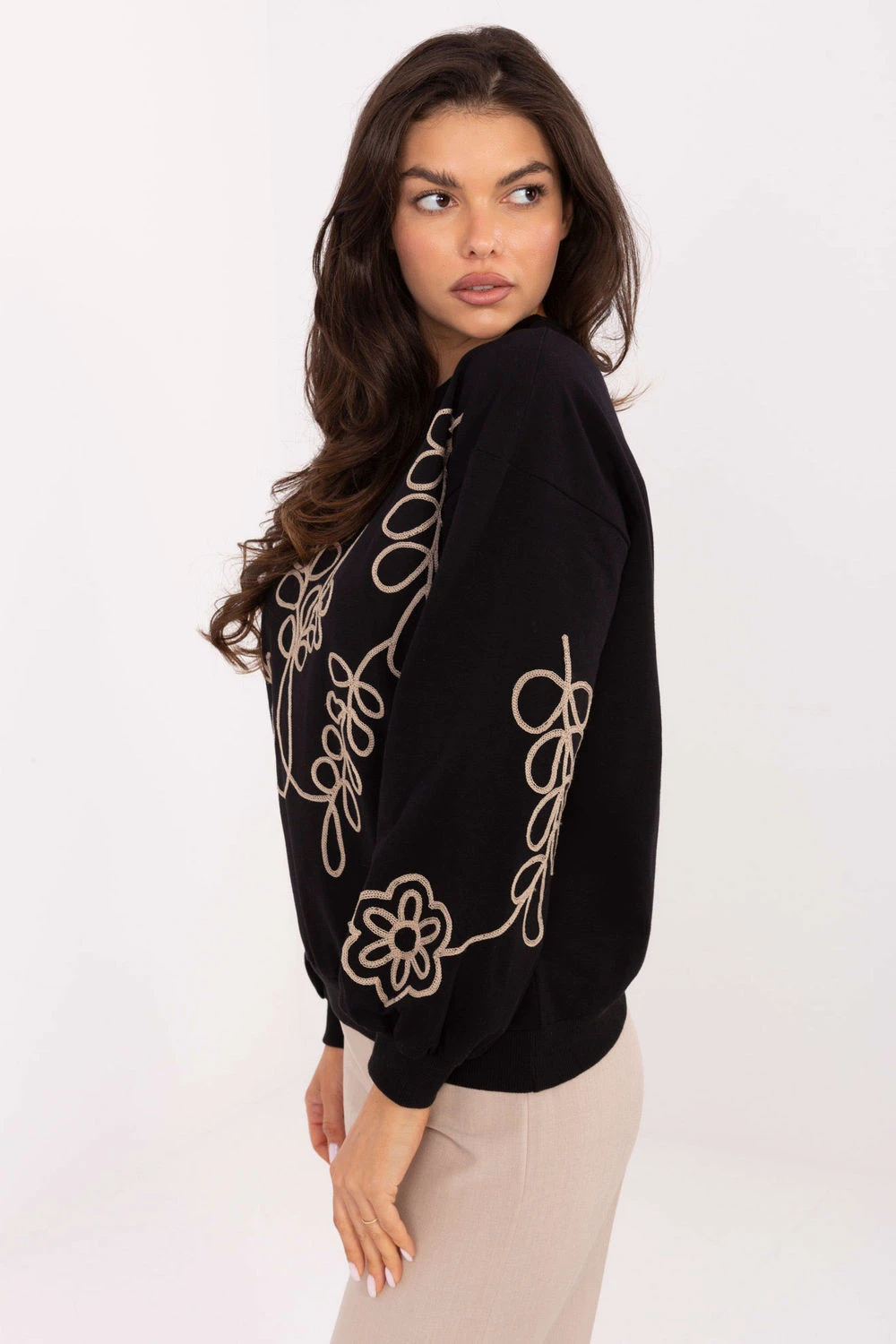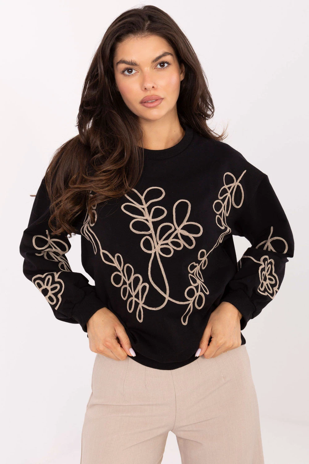 Dámský casual svetr, skvělý na každodenní příležitosti. Vyroben z měkké bavlny s přídavkem elastanu, poskytuje pohodlí a komfort po celý den. Má standardní délku, klasický kulatý výstřih a dlouhé rukávy. Jejímu kouzlu a originalitě dodává jemný vyšívaný motiv umístěný vpředu a na rukávech. Jedná se o univerzální model, který se skvěle hodí do každodenních outfitů jak do práce, tak ve volném čase.