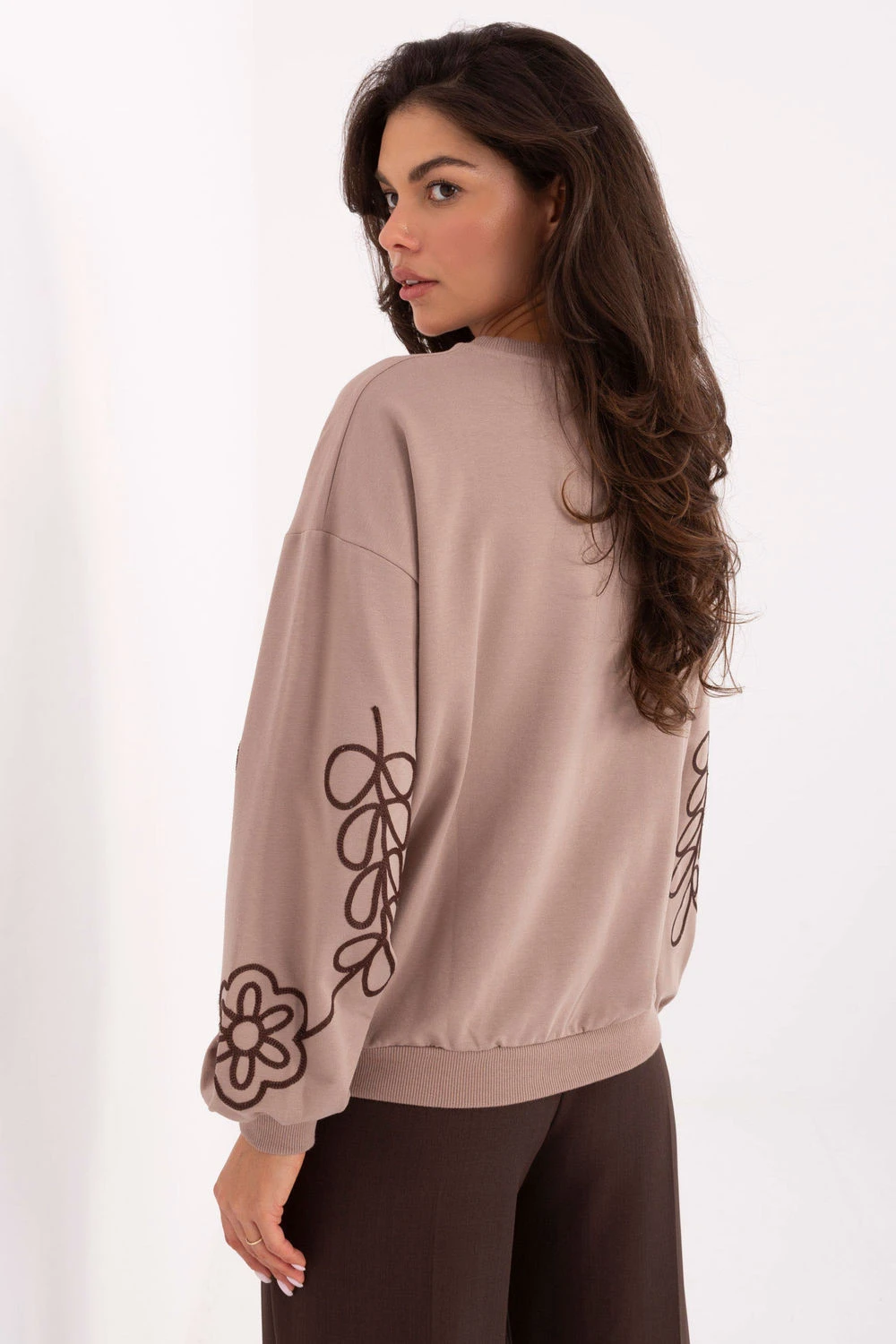 Dámský volný svetr, skvělý na každodenní příležitosti. Vyroben z měkké bavlny s přídavkem elastanu, poskytuje pohodlí a komfort po celý den. Má standardní délku, klasický kulatý výstřih a dlouhé rukávy. Jejímu kouzlu a originalitě dodává jemná výšivka umístěná vpředu a na rukávech. Jedná se o univerzální model, který se skvěle hodí do každodenních stylizací jak do práce, tak ve volném čase.
