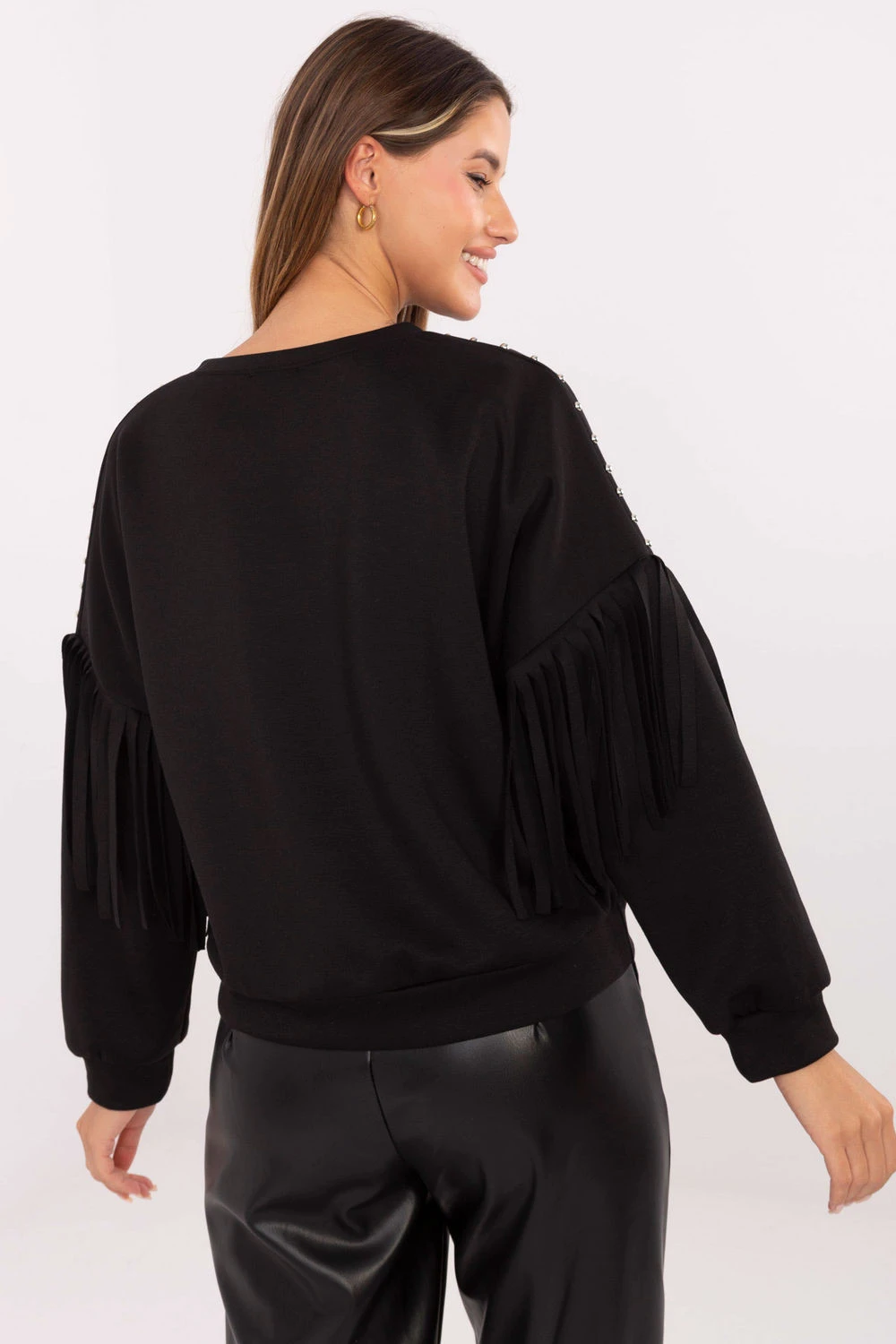 Dámská volná mikina v hladkém provedení je stylovým návrhem na každý den. Vyrobena z měkké směsi viskózy a polyesteru, poskytuje pohodlí při nošení a pohodlí po celý den. Klasický, kulatý výstřih byl ozdoben jemnými nýty, které dávají celku moderní charakter. Dlouhý rukáv s efektními lemy a aplikací nýtů dělá mikinu výraznou ve srovnání s každodenními stylizacemi. Standardní délka a absenci zapínání ji činí praktickým, a zároveň neotřelým prvkem šatníku.