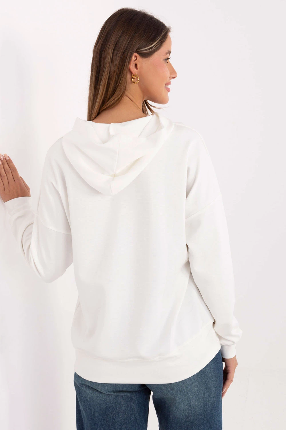 Elegantní dámská mikina s ležérním charakterem, ideální na každý den. Vyrobená z příjemné směsi viskózy, polyesteru a elastanu, poskytuje pohodlí nošení, pružnost a odolnost. Model s standardní délkou, dlouhým rukávem a kapucí je klasikou v moderním provedení. Hladký materiál zajišťuje univerzálnost a snadnou stylizaci, zatímco ozdobné nášivky na spodní části a na kapuci dodávají mikině originální, moderní nádech. Absence zapínání zaručuje volnost a pohodlí při nošení. Ideální k džínům, legínám nebo teplákovým kalhotám, skvělý návrh na každodenní, volné stylizace.