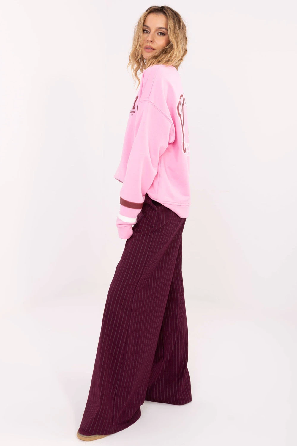 Dámská mikina volného střihu je casual must-have, kombinující pohodlí s módním stylem. Vyrobená z kombinace bavlny a polyesteru poskytuje měkkost, pohodlí nošení a odolnost materiálu. Model s dlouhým rukávem a kulatým výstřihem se vyznačuje kontrastními pruhy na rukávech a potisky a nápisy na přední a zadní straně, které jí dodávají charakter a moderní výraz. Standardní délka dělá z mikiny skvělý doplněk k džínům, legínám nebo sukním v každodenních, volných stylizacích.