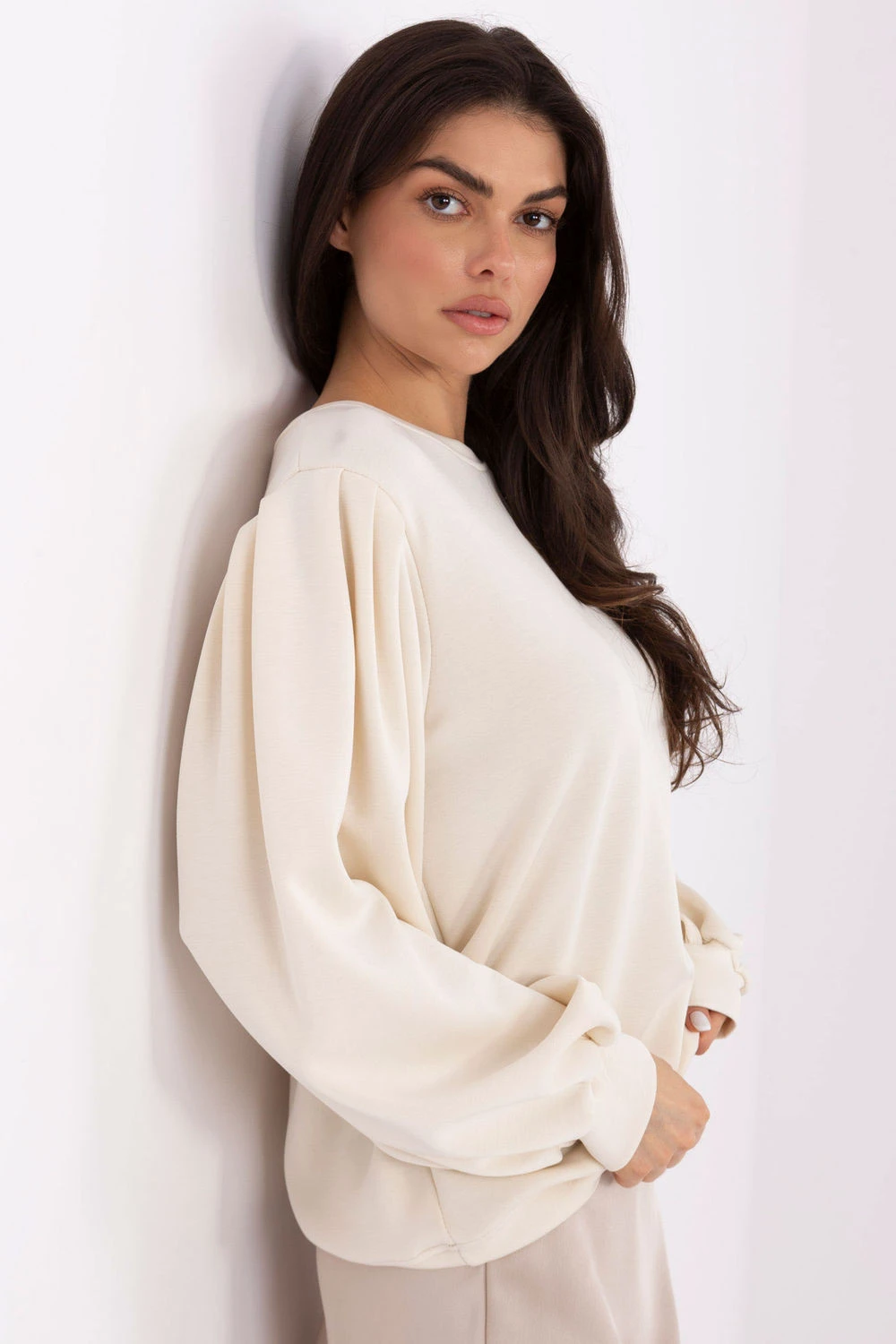 Tato dámská mikina je kvintesencí pohodlí a ženského stylu v každodenním provedení. Vyrobená z materiálu typu měkké máslo, jemného a mimořádně příjemného na dotek, poskytuje nepřekonatelné pohodlí a pocit obalení po celý den. Mikina má ležérní charakter a hladký vzor, díky čemuž se skvěle hodí do mnoha každodenních stylizací, od volných setů s džíny po elegantnější kombinace s látkovými kalhotami nebo sukní. Model standardní délky s kulatým výstřihem a dlouhými rukávy vypadá žensky a decentně. Dalším akcentem jsou objemné rukávy, které mikině dodávají lehkost a moderní charakter. Chybějící zapínání zdůrazňuje její jednoduchost a pohodlnost použití.