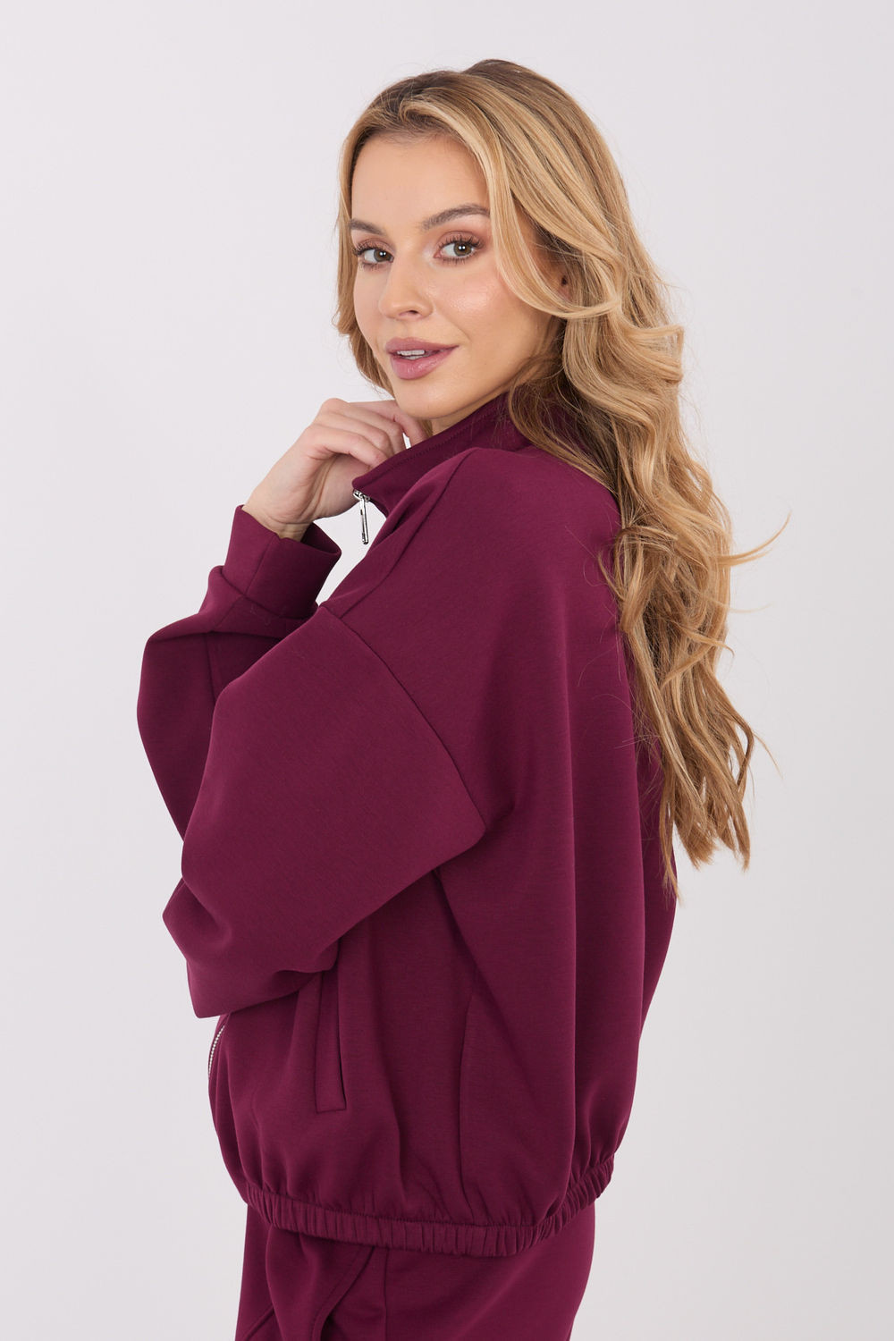 Tato dámská mikina v casual stylu je ideální volbou pro každodenní pohodlné outfit. Vyrobená z kombinace polyesteru, viskózy a elastanu, poskytuje měkkost, pružnost a pohodlí při nošení. Model standardní délky má dlouhý rukáv a praktický stojáček, který dodává sportovní eleganci a chrání před chladem. Mikina je zapínána na zip, co usnadňuje oblékání a umožňuje regulovat úroveň pohodlí. Hladký materiál jí dodává univerzální charakter a vsunuté kapsy zvyšují funkčnost a umožňují vynikající využití každý den. Jedná se o nadčasový kousek šatníku, který snadno sladíte s džíny, legíny nebo teplákovými kalhotami.