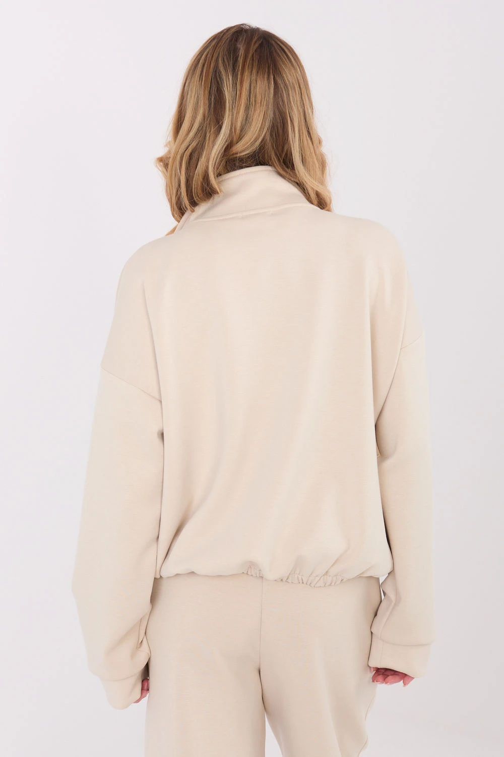 Tento dámský casual svetr je ideální volbou pro každodenní, pohodlné stylingy. Vyrobený z kombinace polyesteru, viskózy a elastanu poskytuje měkkost, pružnost a pohodlí při nošení. Model standardní délky má dlouhý rukáv a praktický stojánek, který přidává sportovní eleganci a chrání před chladem. Svetr se zapíná na zip, co usnadňuje oblékání a umožňuje regulovat úroveň pohodlí. Hladký materiál mu dodává univerzální charakter a vsunuté kapsy zvyšují funkcionalitu a dělají z něj skvělý kousek na každý den. Jedná se o nadčasový kousek šatníku, který si snadno sladíte s džíny, legíny nebo teplákovými kalhotami.