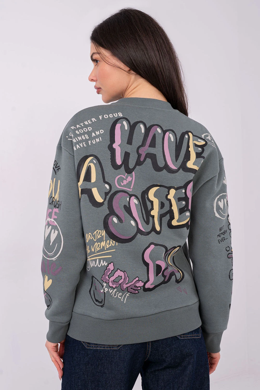 Tato dámská volná blůza je ideální volbou na každodenní příležitosti, spojující pohodlí s módním vzhledem. Model se vyznačuje dominujícím vzorem ve formě potisku a nápisů rozmístěných na celé ploše blůzy, díky čemuž získává stylizace výrazný, moderní charakter. Bluza je vyrobena z bavlny s přídavkem polyesteru, co zajišťuje pohodlí nošení, měkkost a trvanlivost materiálu. Standardní délka, dlouhý rukáv a kulatý výstřih zajišťují skvělé přizpůsobení různým postavám a představuje univerzální kousek šatníku. Model nemá zapínání, nasazuje se přes hlavu, což zdůrazňuje její pohodlný, sportovní charakter. Další výhodou je prošívaný materiál, díky kterému se blůza hodí i do chladnějších dnů. Stylová, praktická a příjemná na nošení, ideální na každý den!