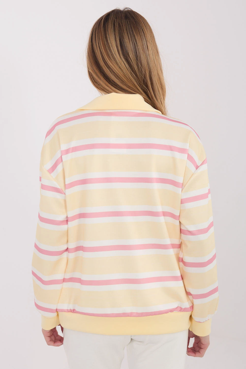 Dámská mikina se pruhy je pohodlný a stylový návrh v casualovém provedení, ideální na každý den. Vyrobená z měkkého a příjemného na dotek materiálu z kombinace viskózy a elastanu, poskytuje pohodlí při nošení a volnost pohybu po celý den. Klasický pruhový vzor dodává mikině nadčasový charakter a umožňuje snadné sladění s mnoha stylizacemi. Model s standartní délkou a dlouhými rukávy se skvěle osvědčí v chladnějších dnech. Krátký zipový límeček je praktickým a stylovým detail, který umožňuje upravit výstřih podle vlastních preferencí. Mikina nemá žádné další zapínání, díky čemuž je pohodlná a snadno se obléká. Jedná se o univerzální kus oblečení, který skvěle ladí s džíny, látkovými kalhotami nebo legíny, vytvářející pohodlné a moderní sestavy na každý den.