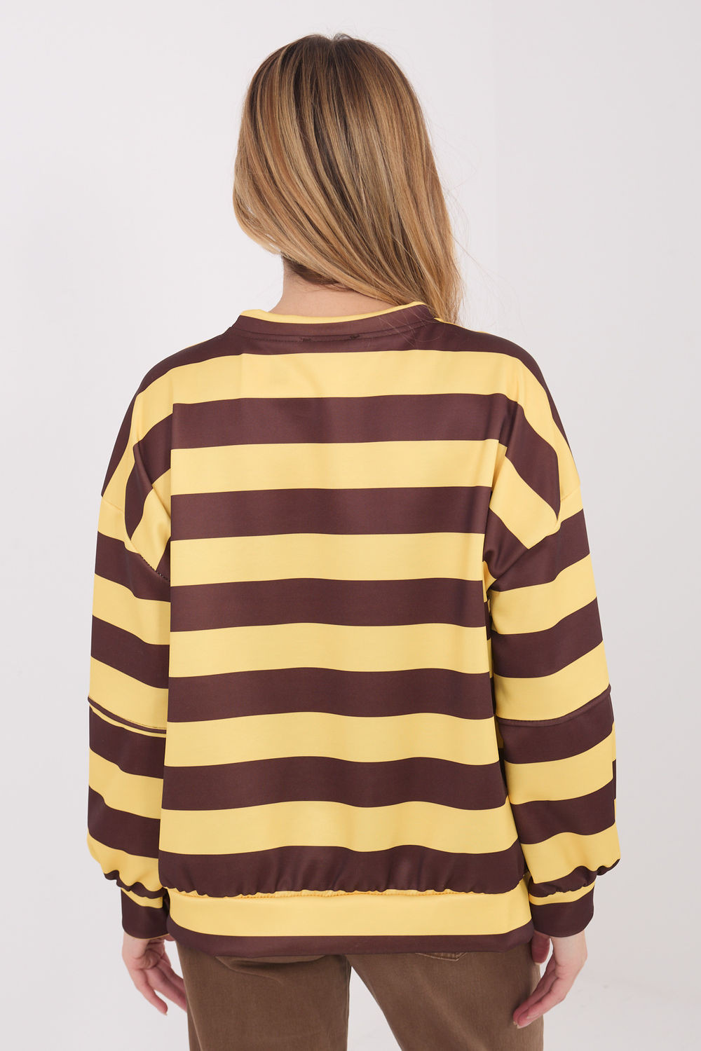 Stylová dámská mikina s casual charakterem, ideální na každý den. Vyznačuje se módním pruhovaným vzorem, který jí dodává moderní a univerzální vzhled. Vyrobená z příjemné viskózy s přídavkem elastanu, díky čemuž je měkká, elastická a pohodlná na nošení po celý den. Model standardní délky s dlouhým rukávem a kulatým výstřihem, který klasicky padá na postavu. Mikina nemá zapínání, co zdůrazňuje její volný styl a pohodlí nošení. Další výhodou je dekorativní nášivka na rukávu, která dodává celku originální charakter. Skvěle se hodí do každodenních stylizací, jak s džínami, tak s látkovými kalhotami nebo legíny.