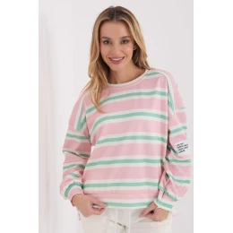 Elegantní dámská mikina s casual charakterem, ideální na každodenní nošení. Vyniká módním pruhovaným vzorem, který jí dodává moderní a univerzální vzhled. Vyrobená z příjemné viskózy s přídavkem elastanu, díky čemuž je měkká, elastická a pohodlná na nošení po celý den. Model s standardní délkou, dlouhým rukávem a kulatým výstřihem, který klasicky padá na postavu. Mikina nemá zapínání, co zdůrazňuje její volný styl a pohodlí nošení. Další výhodou je dekorativní nášivka na rukávu, která dodává celku originální charakter. Skvěle se hodí do každodenních outfitů, jak s džíny, tak s látkovými kalhotami nebo legíny.