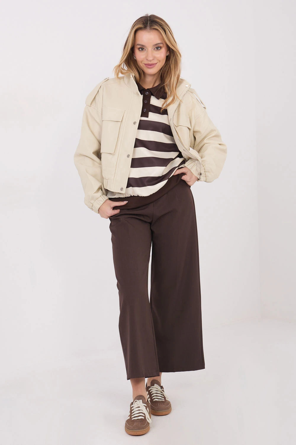 Casuální dámská mikina s nadčasovým a univerzálním stylem, ideální pro každodenní outfit. Model vyniká módním pruhovaným vzorem, který dodává celku svěžest a lehce sportovní charakter. Mikina je vyrobena z vysoce kvalitní viskózy s přídavkem elastanu, co zajišťuje měkkost, pružnost a vysoký komfort nošení. Střih s standardní délkou a dlouhým rukávem se dobře přizpůsobuje postavě a osvědčí se po celou sezónu. Zapínání na knoflíky na přední straně typu polo ve spojení s klasickým límcem dodává mikině elegantní, ale zároveň uvolněný vzhled. Jedná se o skvělý návrh pro ženy, které ocení pohodlí spojené s propracovanými detaily. Mikina skvěle ladí s džínsy, látkovými kalhotami nebo sukni, vytvářející stylové kombinace na každý den.