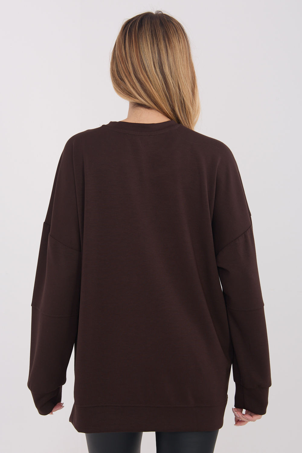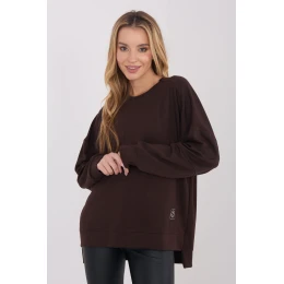 Dámská mikina ve stylu casual je pohodlný a stylový návrh na každý den. Vyrobená z příjemné viskózy s přídavkem elastanu poskytuje pohodlí, pružnost a dobře padne k postavě. Hladký vzor zdůrazňuje její univerzální charakter a dělá mikinu skvěle ladící s mnoha kousky oblečení. Standardní délka s lehce prodlouženým zády dodává moderní vzhled a jemně zeštíhlí postavu. Dlouhý rukáv a kulatý výstřih zaručují pohodlí a volnost pohybů. Model bez zapínání, doplněný o malou nášivku dole na levé straně, která představuje jemný, módní akcent.