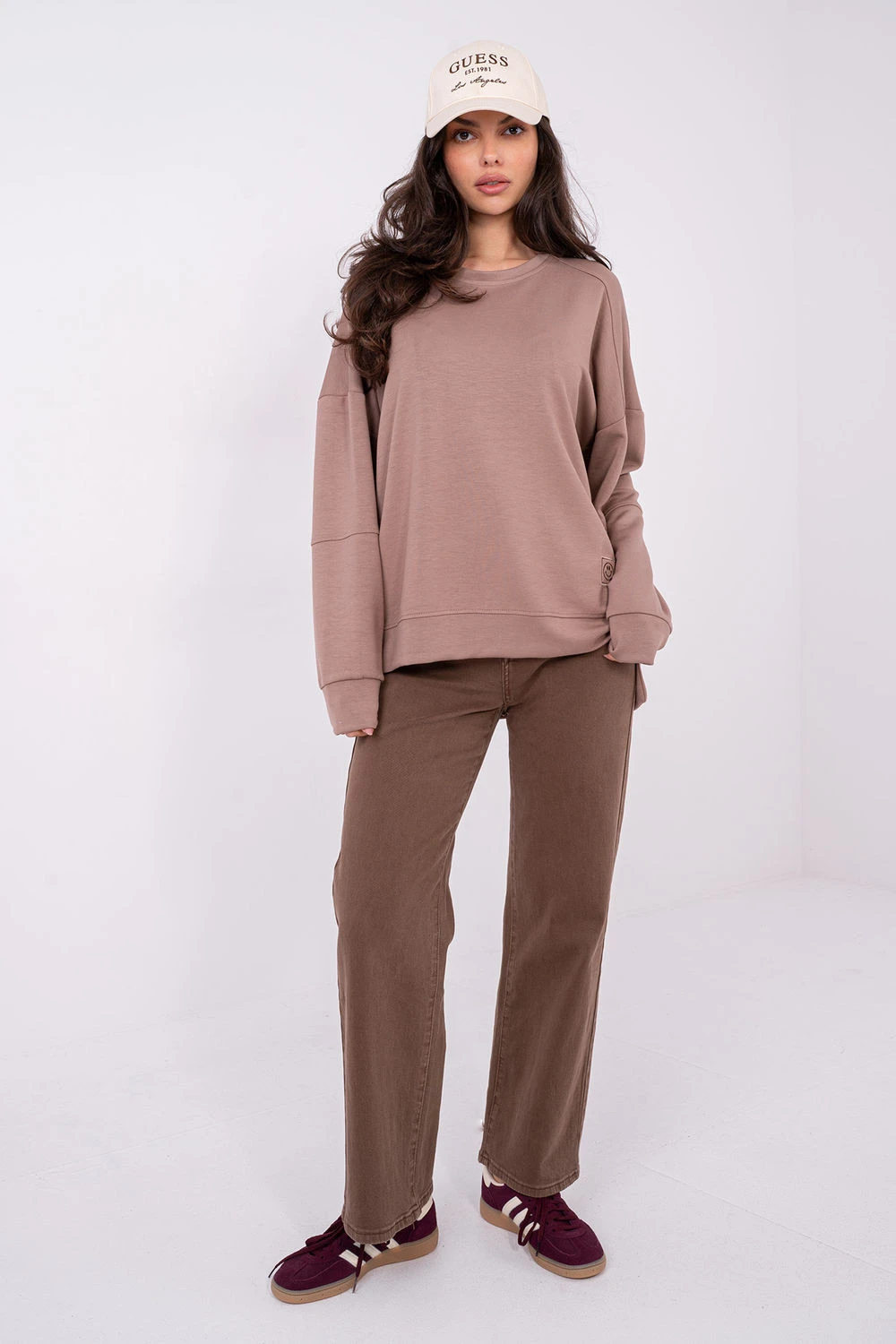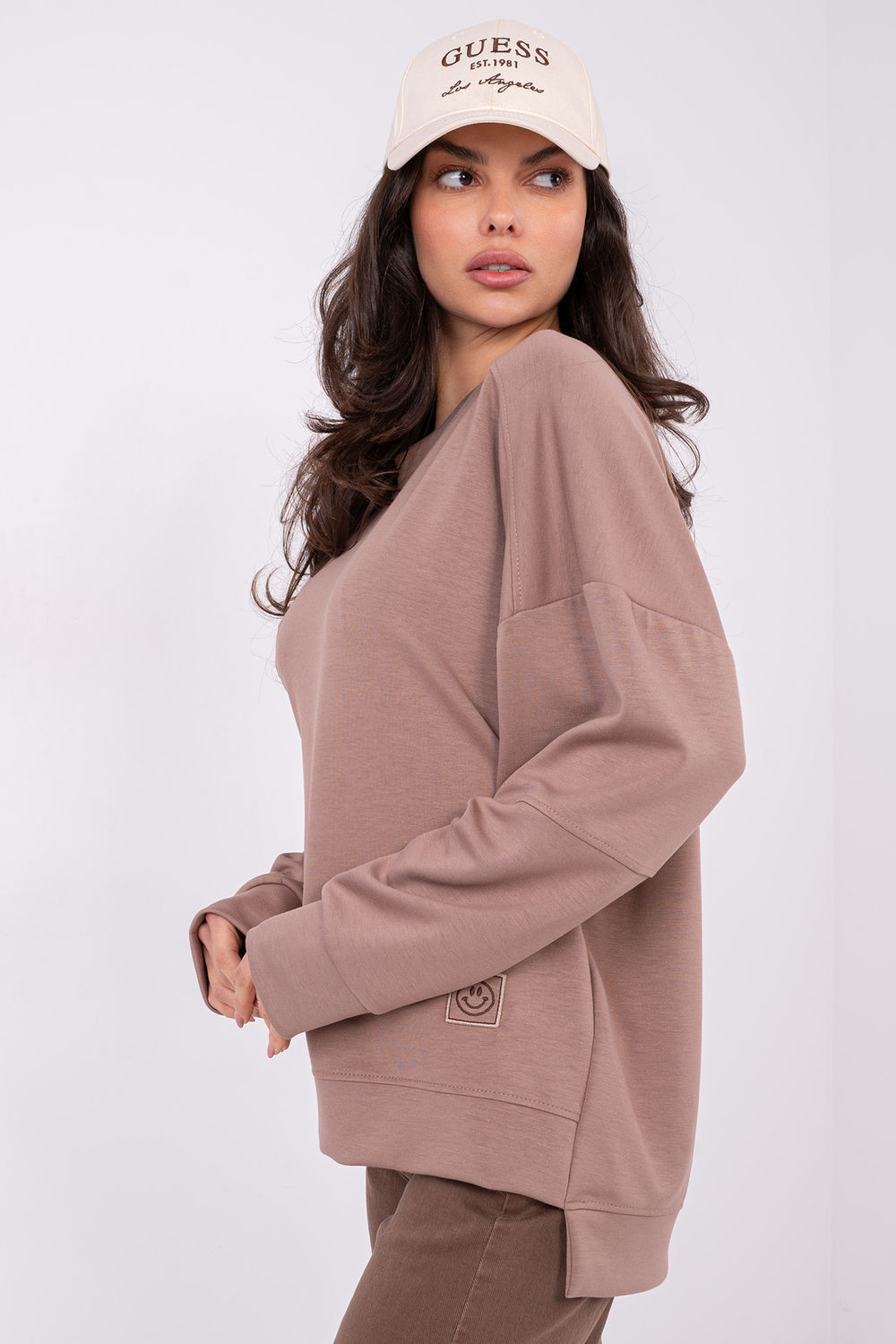 Dámská mikina ve volném stylu je pohodlný a stylový návrh na každý den. Vyrobená z příjemné viskózy s přídavkem elastanu poskytuje pohodlí nošení, pružnost a dobře padne k postavě. Hladký vzor zdůrazňuje její univerzální charakter a dělá mikinu skvěle sladěnou s mnoha kousky šatníku. Standardní délka s mírně prodlouženým zadním dílem dodává moderní vzhled a jemně zúží postavu. Dlouhý rukáv a kulatý výstřih zaručují pohodlí a volnost pohybů. Model bez zapínání, doplněný o malou nášivku dole vlevo, která představuje decentní, módní akcent.