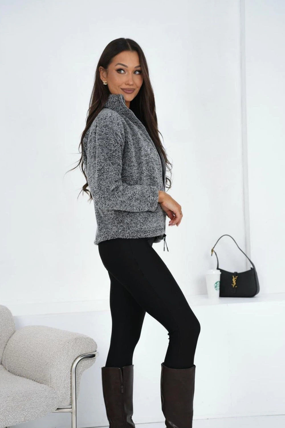 Casual dámská mikina z měkkého materiálu typu ?medvěd? je skvělou volbou na každý den. Vyrobená z příjemného polyesteru, poskytuje pohodlí a teplotu v chladnějších dnech. Model s standardní délkou a dlouhým rukávem je vybaven praktickým stojáčkem chránícím krk před chladem. Mikina se zapíná na zip, co zvyšuje pohodlí nošení a umožňuje snadné sladění s outfit. Hladký vzor jí dodává univerzální charakter, a kapsy jsou funkčním doplňkem pro drobnosti nebo zahřátí rukou. Ideální pro každodenní, volné outfit s džínami, legíny nebo tepláky.
