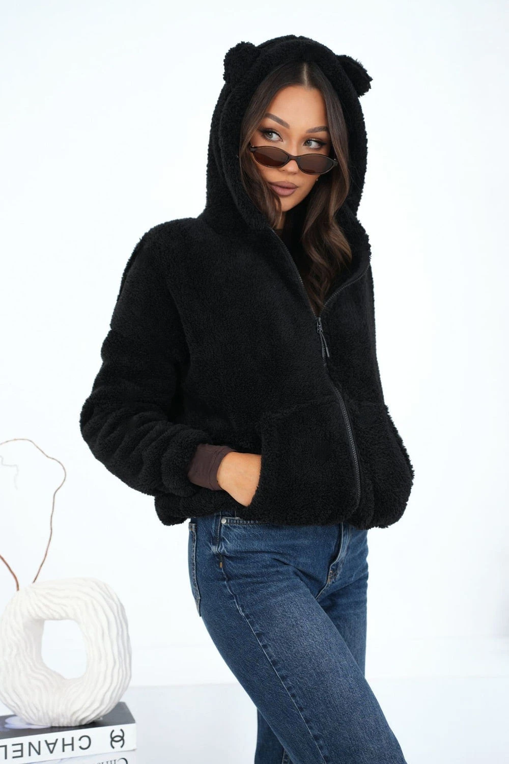 Casual dámská mikina vyrobená z měkkého materiálu typu "medvěd" je ideální nabídkou pro milovnice pohodlí a roztomilého stylu. Vyrobena z příjemného polyesteru, poskytuje pohodlí a příjemné zahřátí v chladnějších dnech. Model s standardní délkou a dlouhým rukávem, vybavený kapucí s ozdobnými ušima, které dávají mikině originální a dívčí charakter. Mikina se zapíná na zip, co usnadňuje oblékání a umožňuje regulovat přizpůsobení. Hladký vzor dělá model univerzálním a snadno stylizovatelným, a praktické kapsy zvyšují funkcionalitu. Skvěle se hodí k každodenním volným outfitům.
