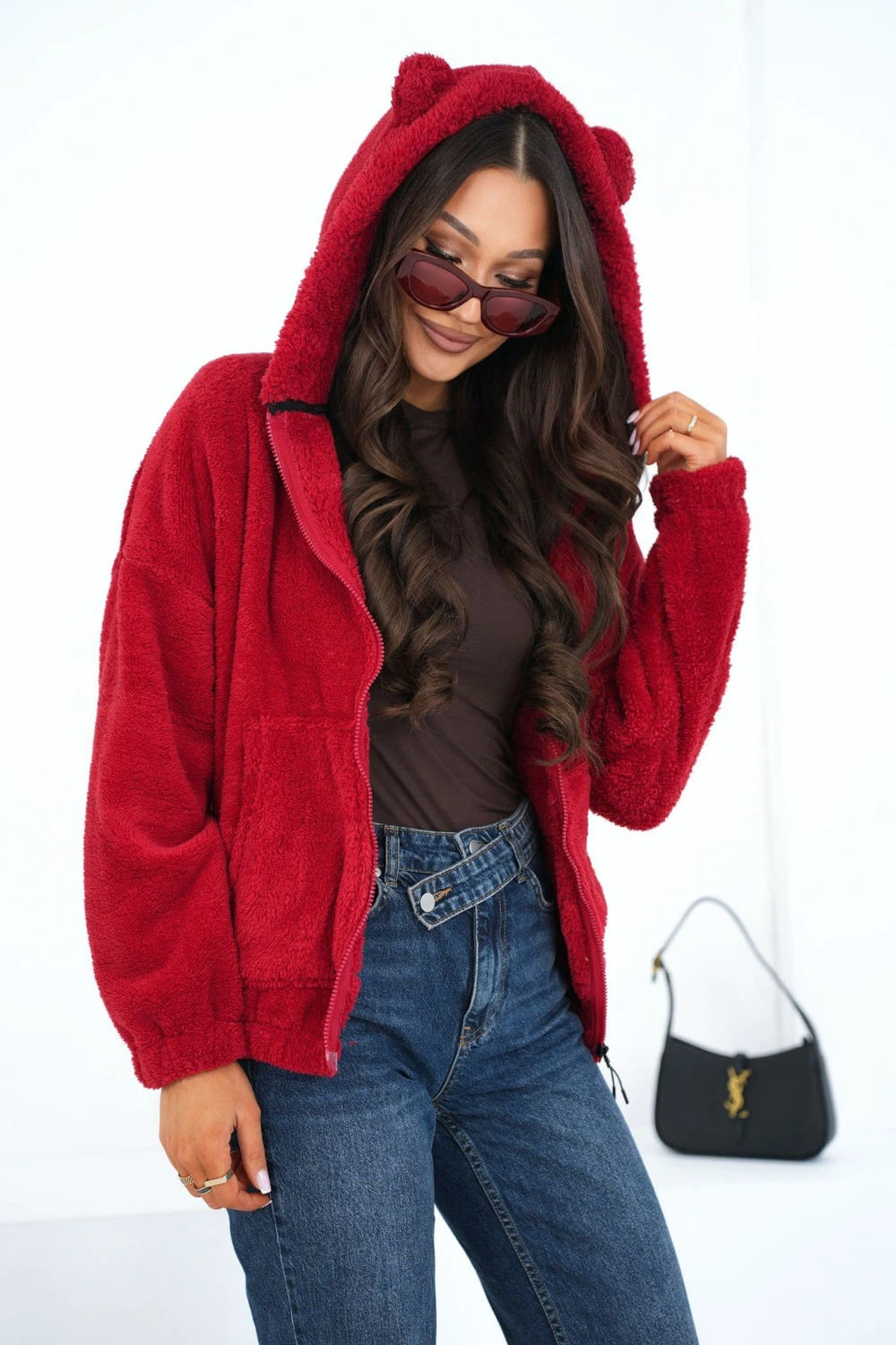 Casual dámská mikina vyrobená z měkkého materiálu typu "medvěd" je ideální volbou pro milovnice pohodlí a roztomilého stylu. Vyrobená z příjemného polyesteru, poskytuje pohodlí a příjemné zahřátí v chladnějších dnech. Model s standardní délkou a dlouhým rukávem je vybaven kapucí s ozdobnýma ušima, které dávají mikině originální a dívčí charakter. Mikina se zapíná na zip, co usnadňuje oblékání a umožňuje regulovat přizpůsobení. Hladký vzor dělá model univerzálním a snadno kombinovatelným, zatímco praktické kapsy zvyšují funkčnost. Skvělá pro každodenní, volné outfitování.
