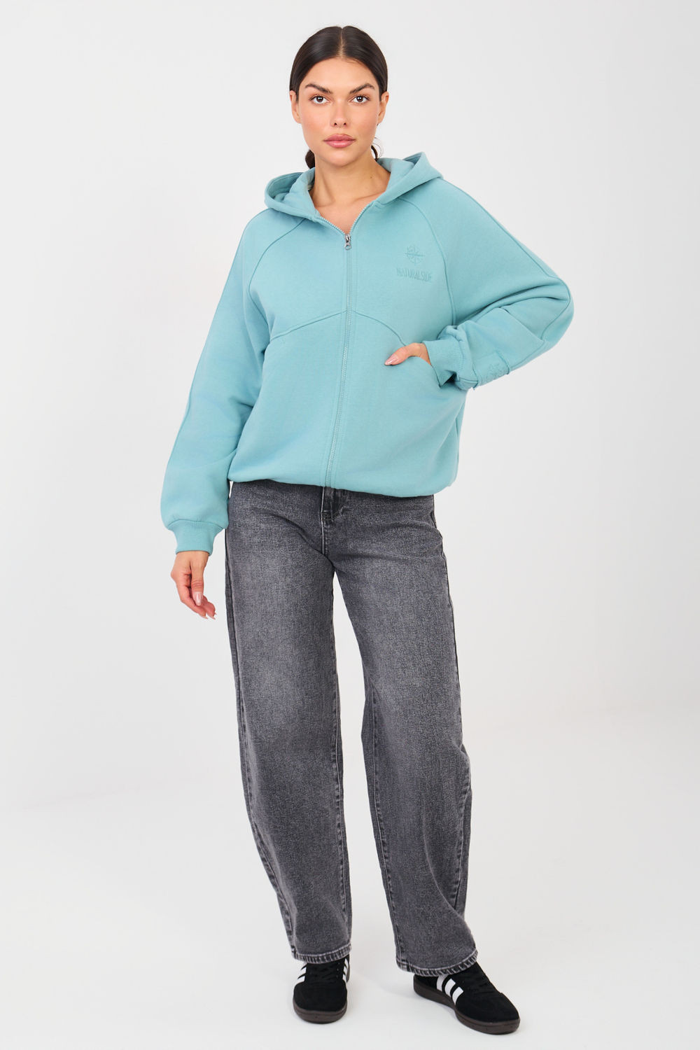 Dámská mikina ve stylu casual je pohodlnou a univerzální nabídkou na každý den. Vyrobená z vysoké kvality směsi bavlny a polyesteru poskytuje pohodlí, měkkost a odolnost. Hladký vzor dává mikině klasický, nadčasový charakter a snadno se hodí k různým stylizacím. Model standardní délky s dlouhým rukávem a praktickou kapucí je ideální pro každodenní aktivity. Zapínání na zip usnadňuje oblékání a nastavení, a kapsy na zip zvyšují funkčnost. Jemný vyšívaný motiv umístěný na přední straně, na úrovni hrudníku na levé straně, dodává celku stylový akcent a zdůrazňuje výjimečný charakter mikiny. Ideální pro městské, každodenní outfity.