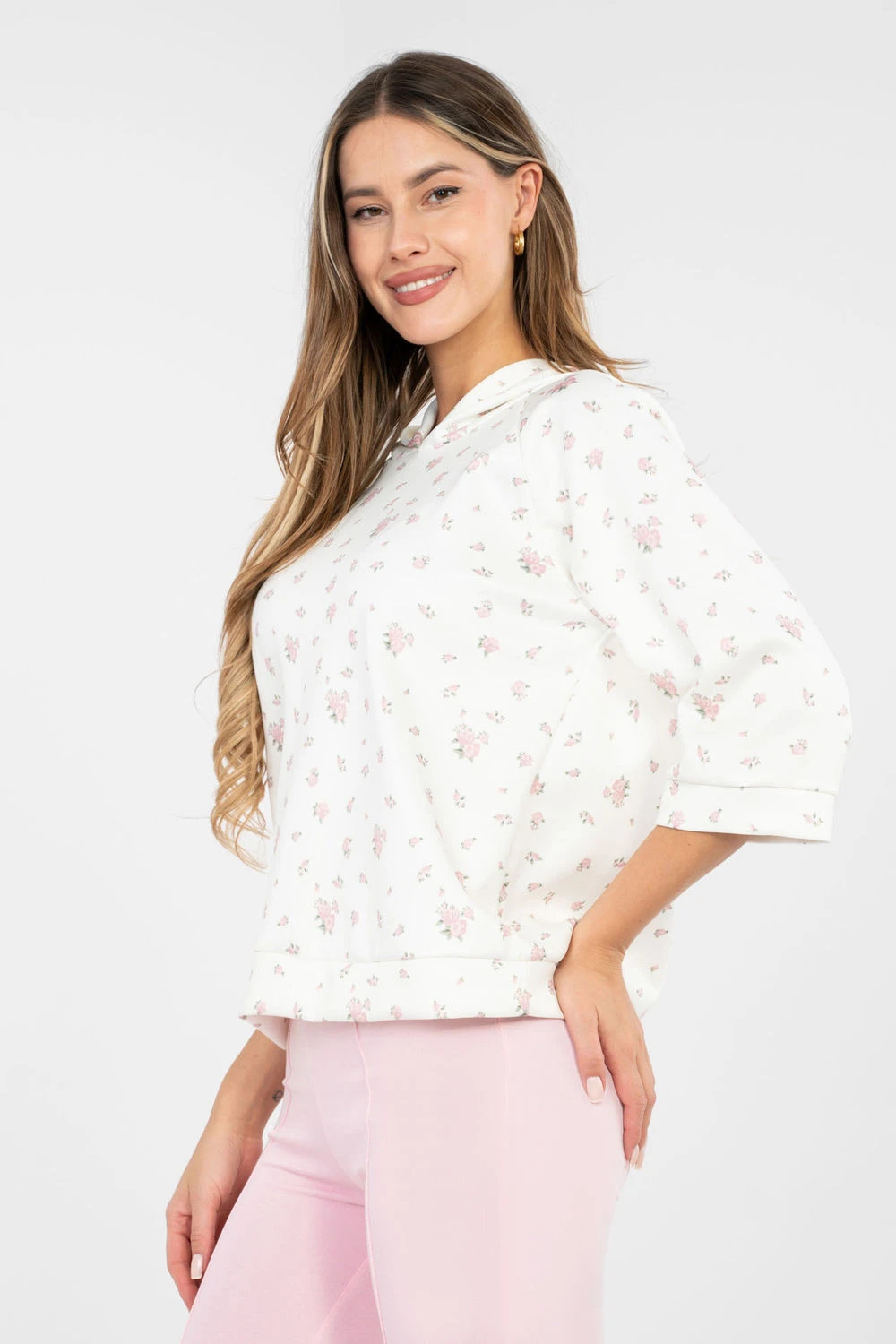 Casual dámská mikina standardní délky je ideální volbou na každý den. Vyniká ženským květinovým potiskem, který dodává outfitu svěžest a lehkost. Model s 3/4 rukávem se skvěle hodí na přechodné období roku, poskytuje pohodlí a volnost pohybu. Mikina nemá kapuci ani zapínání, díky čemuž má jednoduchý, univerzální střih, který snadno sladíte s mnoha outfitovými styly, jak s džíny, tak i sukní. Vyrobená z kombinace polyesteru, viskózy a elastanu, spojuje odolnost s měkkostí a pružností materiálu, což zaručuje pohodlí nošení po celý den.