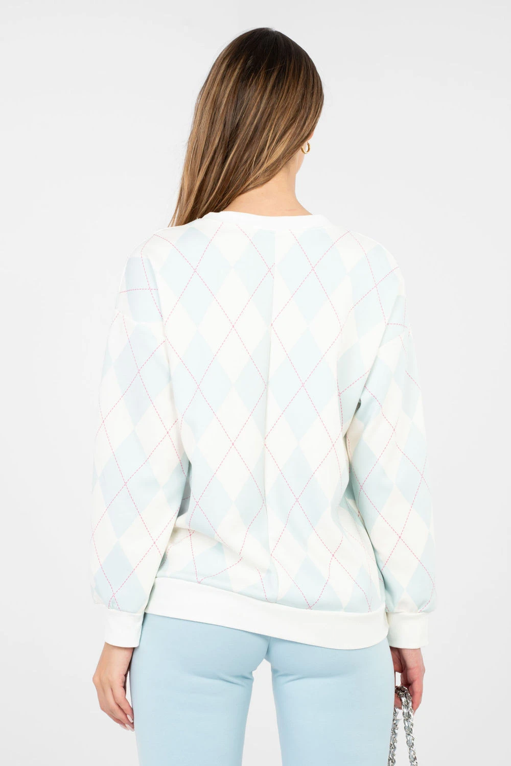 Dámská casualová mikina vyrobená z materiálu typu butter je spojením pohodlí a stylu. Tkanina je měkká, jemná a mimořádně příjemná na dotek, což zajišťuje maximální pohodlí po celý den. Model standardní délky má klasický kulatý výstřih a dlouhé rukávy, což z ní dělá skvělou volbu do každodenních stylizací. Geometrický vzor dodává celku moderní charakter a přitahuje pohled, přidávající originalitu stylizaci. Mikina nemá zapínání, co zdůrazňuje její volný střih. Vyrobená z kombinace polyesteru, viskózy a elastanu spojuje trvanlivost s pružností a lehkostí, ideálně se přizpůsobující siluetě. Je to skvělý návrh na každý den jak k džínám, tak k sportovním kalhotám nebo sukni.