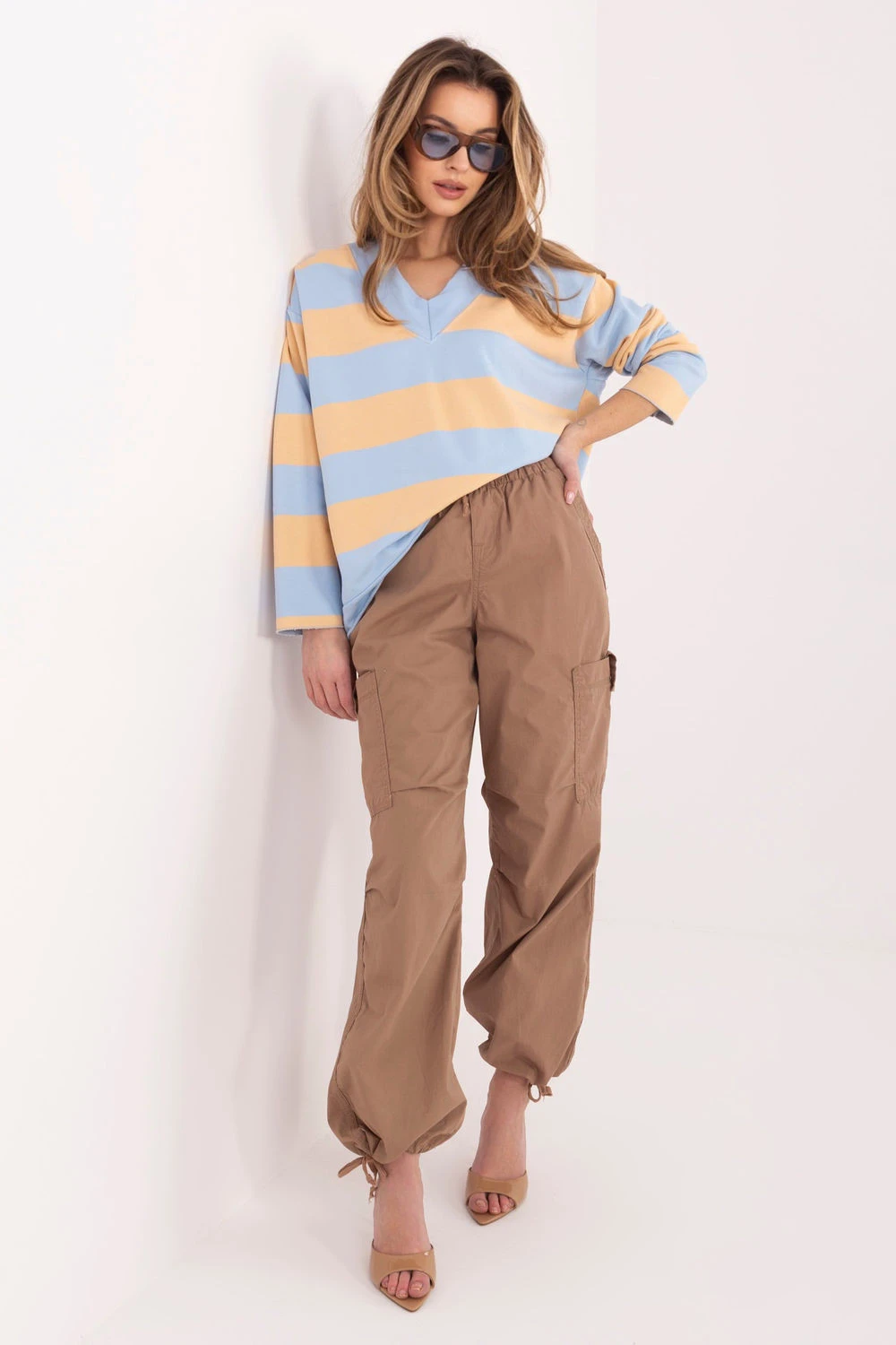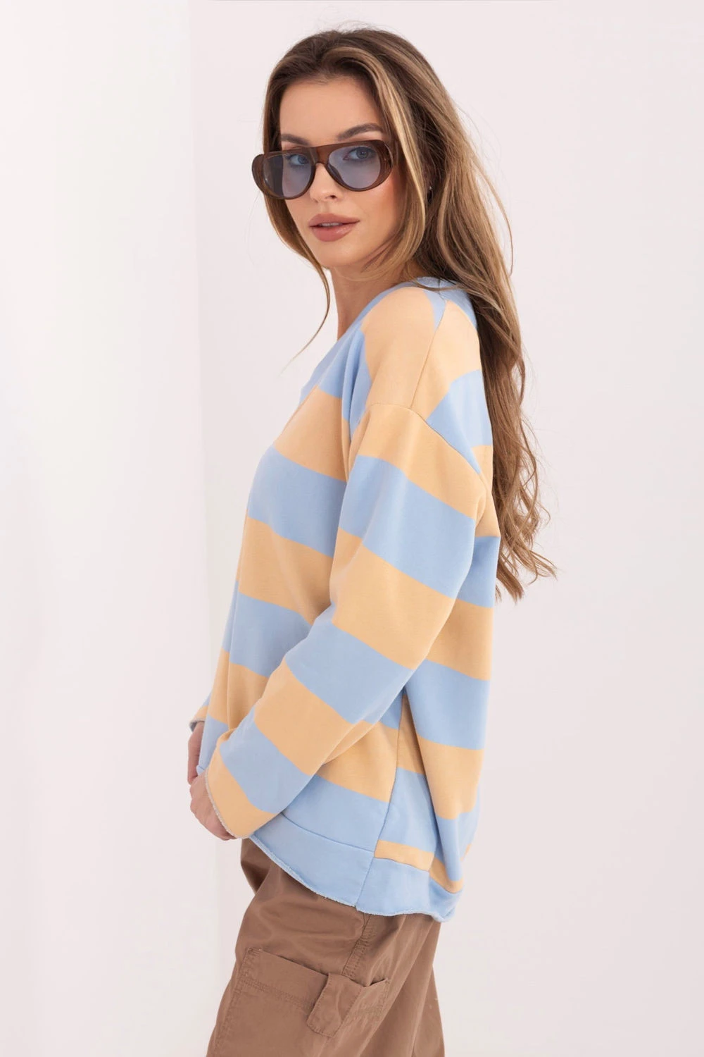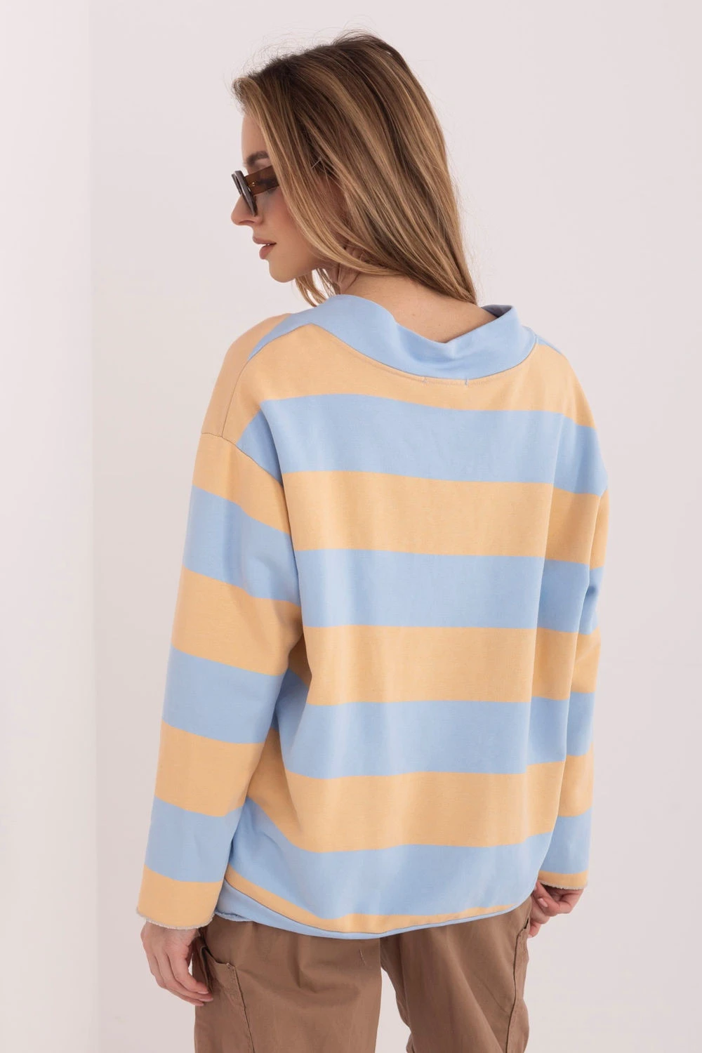 Stylová dámská mikina s ležérním charakterem je skvělým návrhem na každý den. Osveří se jak v městských stylizacích, tak během relaxace nebo setkání s přáteli. Výrazný vzor v pestrobarevných pruzích jí dodává módní a svěží vzhled a přitahuje pozornost. Model s standardní délkou poskytuje pohodlí a volnost pohybu, zatímco dlouhé rukávy dělají mikinu ideální pro chladnější dny. Výstřih do V decentně zdůrazňuje krk a dodává celku ženský charakter. Mikina nemá zapínání, díky čemuž je snadno nasaditelná a skvěle padne na postavě. Vyrobená z vysokokvalitní směsi bavlny a polyesteru spojuje v sobě hebkost, prodyšnost a odolnost materiálu. Je to univerzální kousek šatníku, který skvěle doplní jak džíny, tak látkové kalhoty nebo sukně, vytvářející pohodlné a stylové sestavy na každou příležitost.