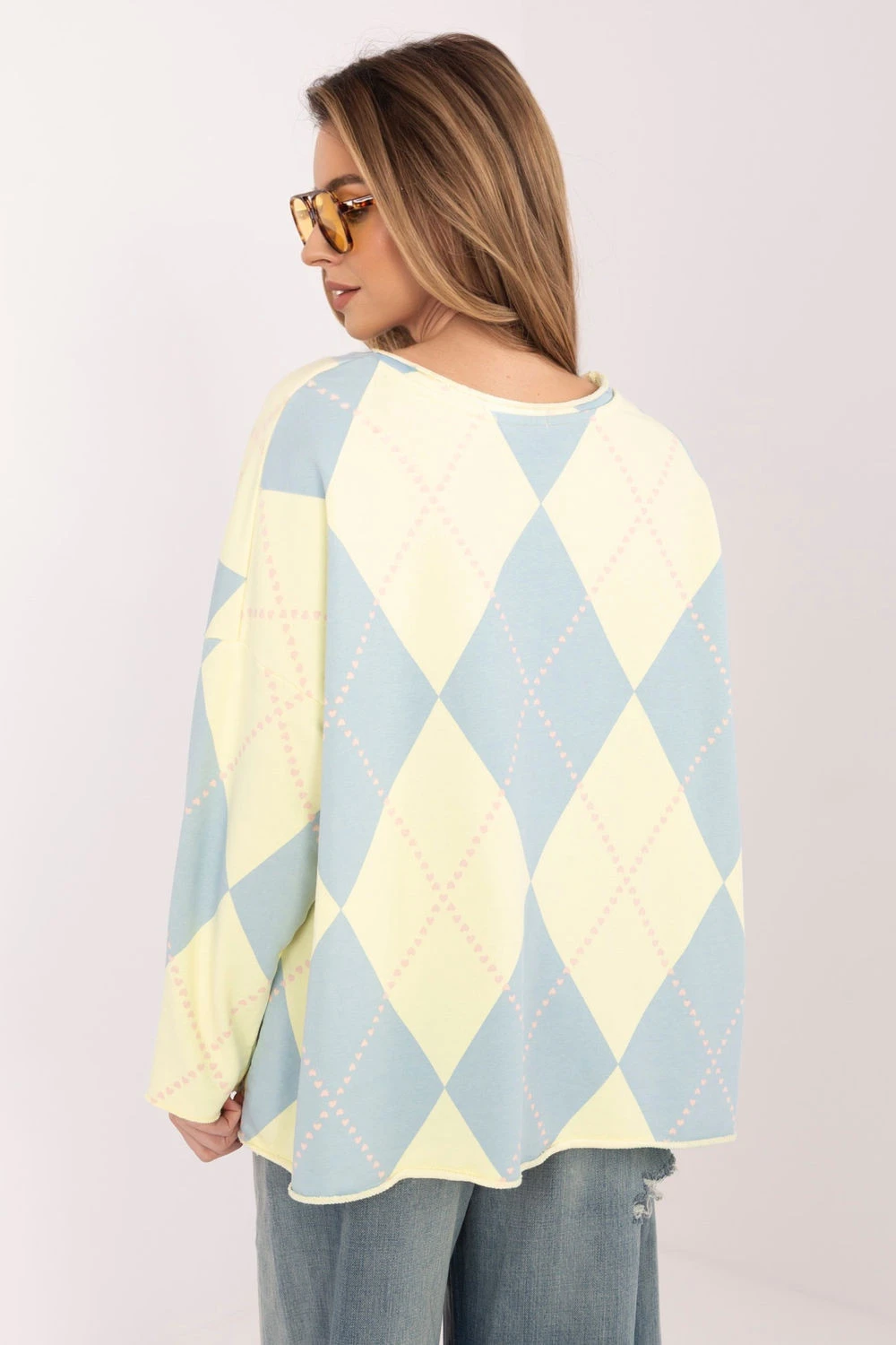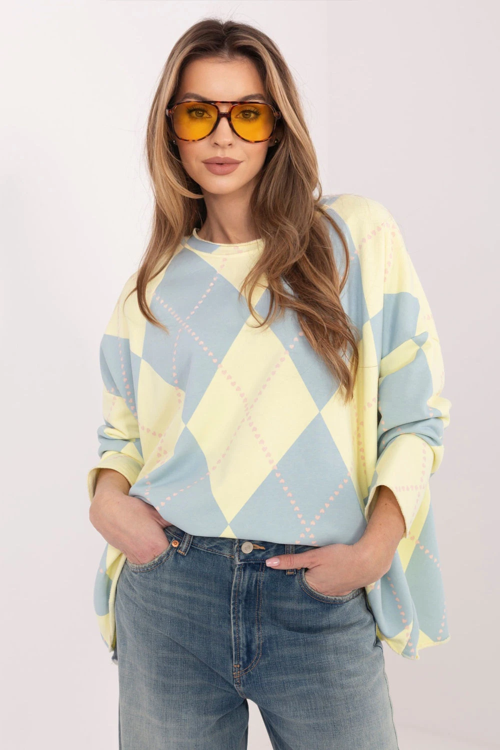 Moderní dámská blůza ve stylu oversize je ideální volbou pro ženy, které ocení pohodlí a volný, ležérní styl. Volnější střih zajišťuje pohodlí nošení a zapadá do současných trendů, dodávající stylizaci nedbalý charakter. Model s standardní délkou se skvěle hodí k postavě a skvěle ladí jak s přiléhavými džíny, legíny, tak s košilí nebo sukní. Dlouhé rukávy zvyšují funkčnost blůzy, dělají ji vhodnou i na chladnější dny. Kulatý výstřih dodává celku klasického zpracování a dělá z blůzy univerzální a pohodlný kousek do každodenního nošení. Bez zapínání zdůrazňuje její minimalistický charakter a usnadňuje rychlé oblékání. Geometrický vzor je moderním, přitažlivým akcentem, který model vyzdvihuje a dodává stylizaci originalitu. Je to skvělá volba na každý den - pohodlná, moderní a plná charakteru.