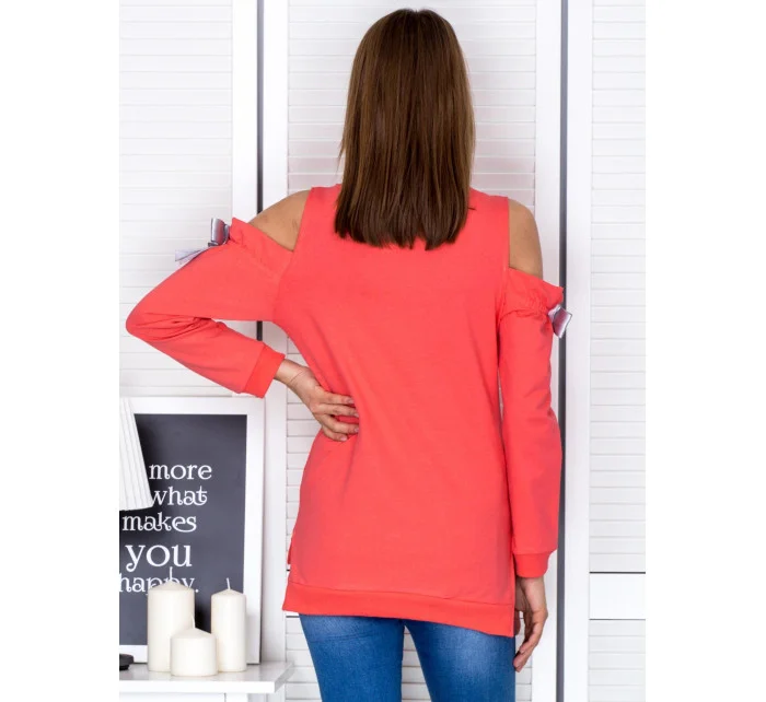 Mikina svýřezy na ramenou a mašlemi v korálové barvě.