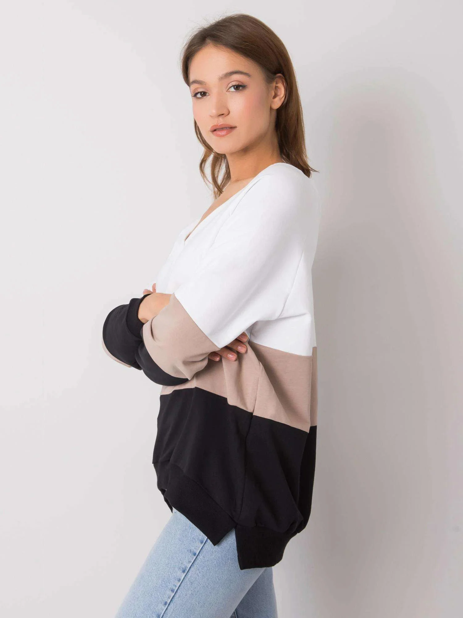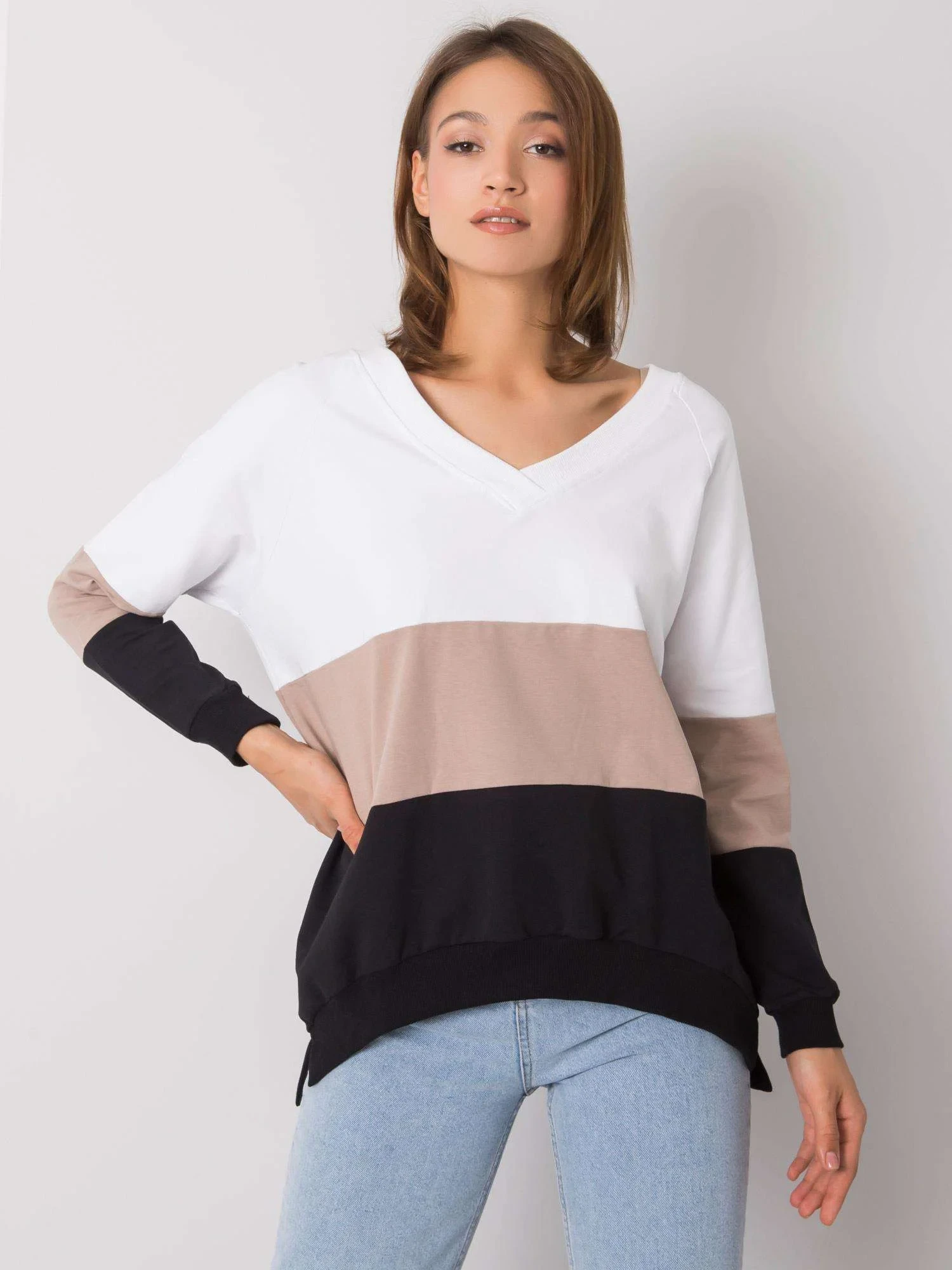 RUE PARIS Černo-béžová mikina se srdíčkovým výstřihem.