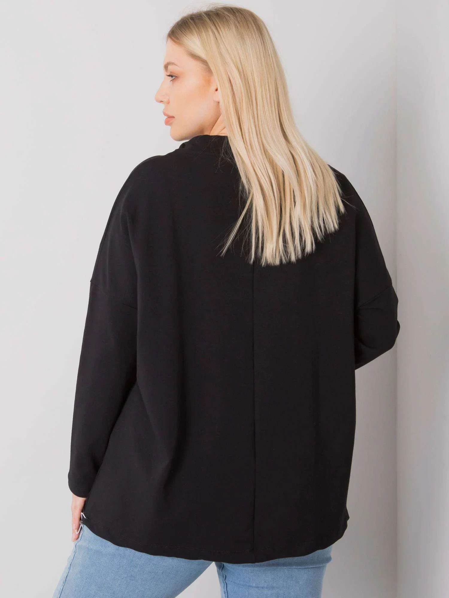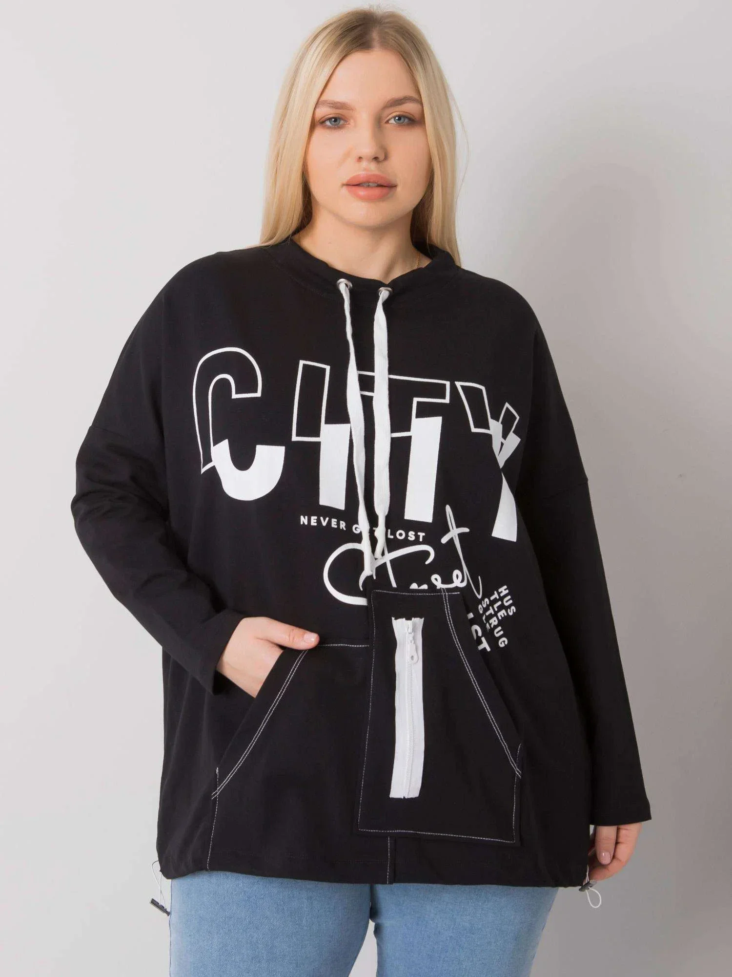 Černá plus size mikina s potiskem a kapsami.