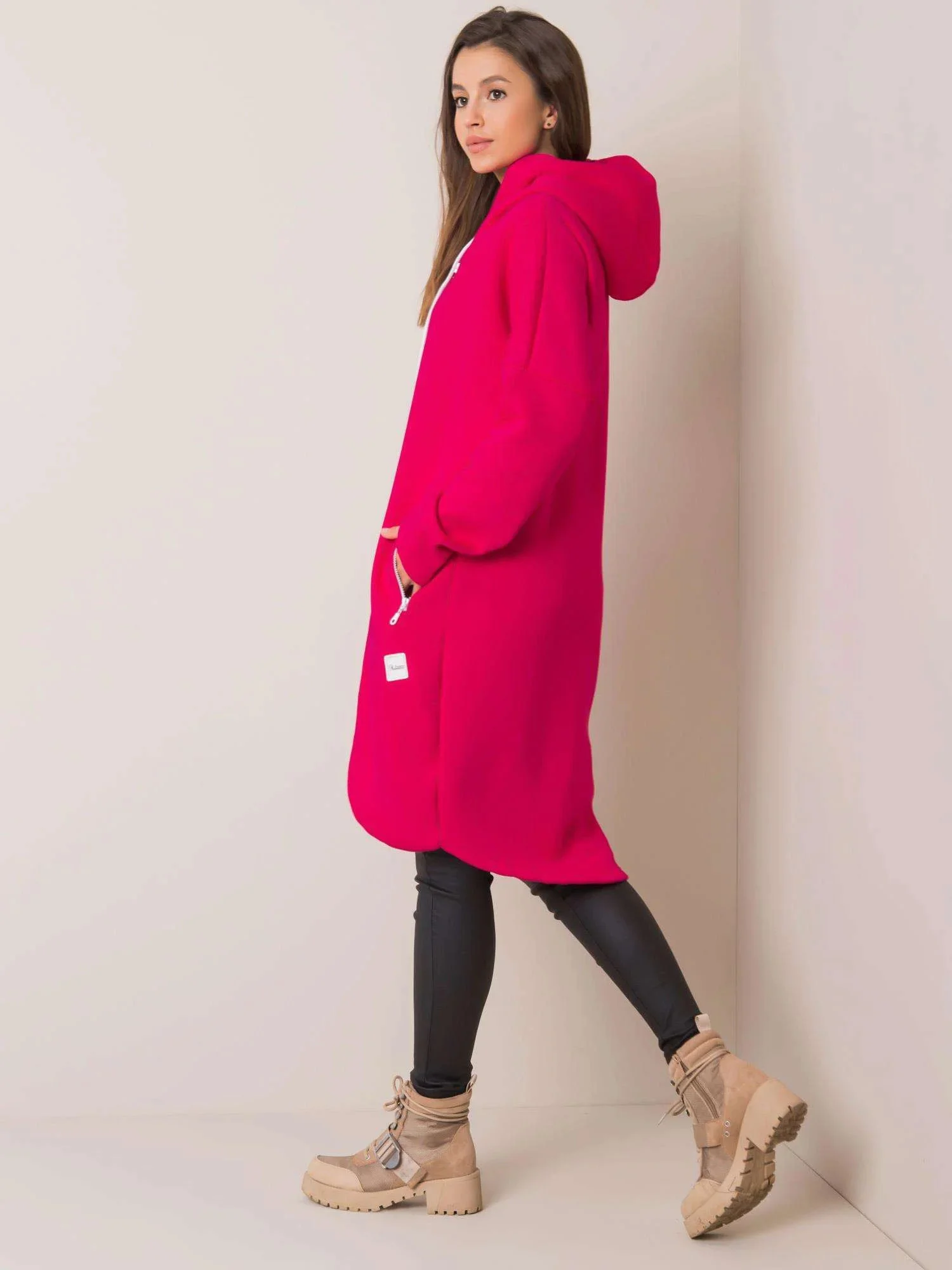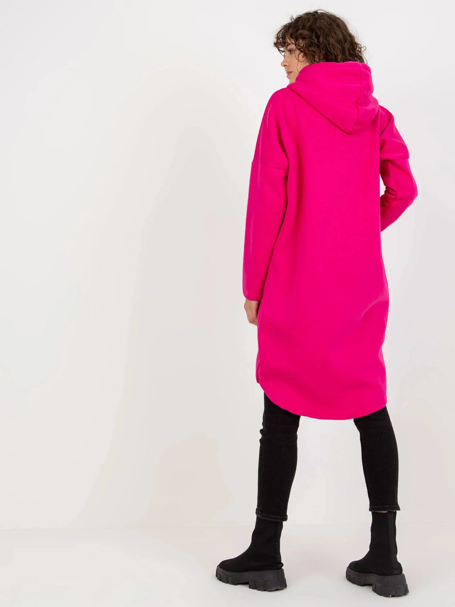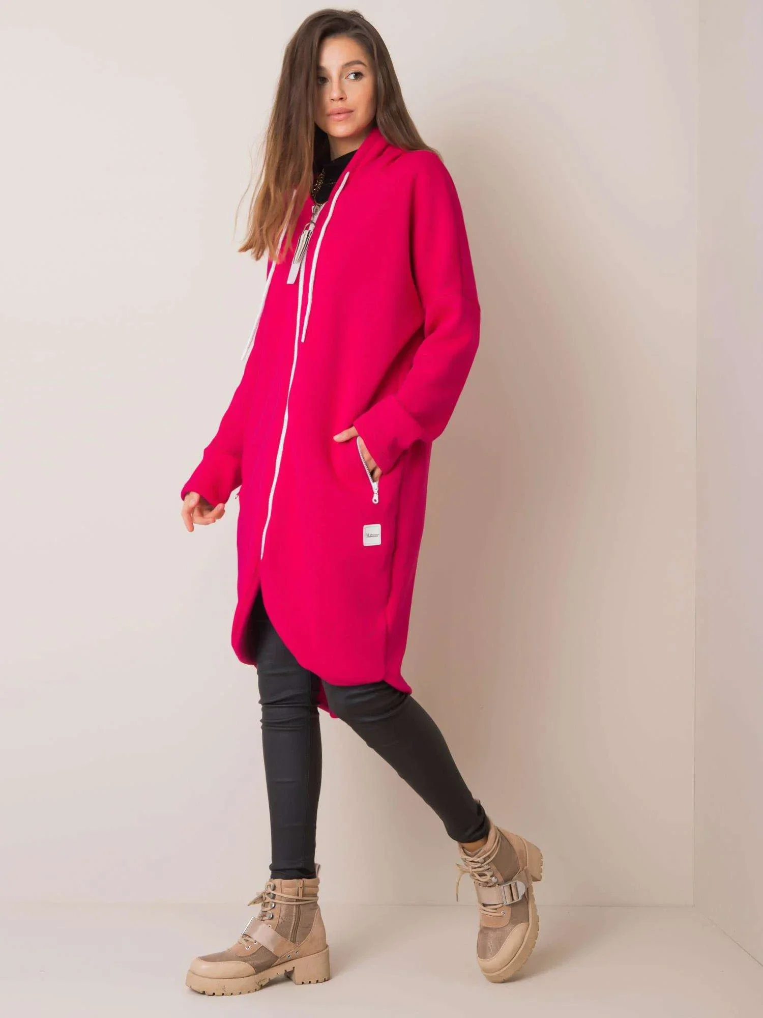 Fuchsiová dlouhá mikina s kapucí.