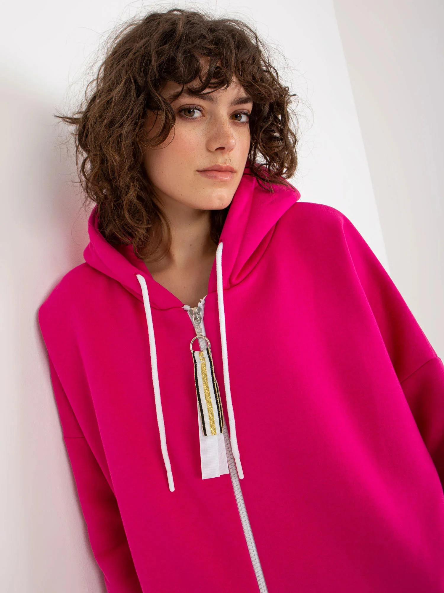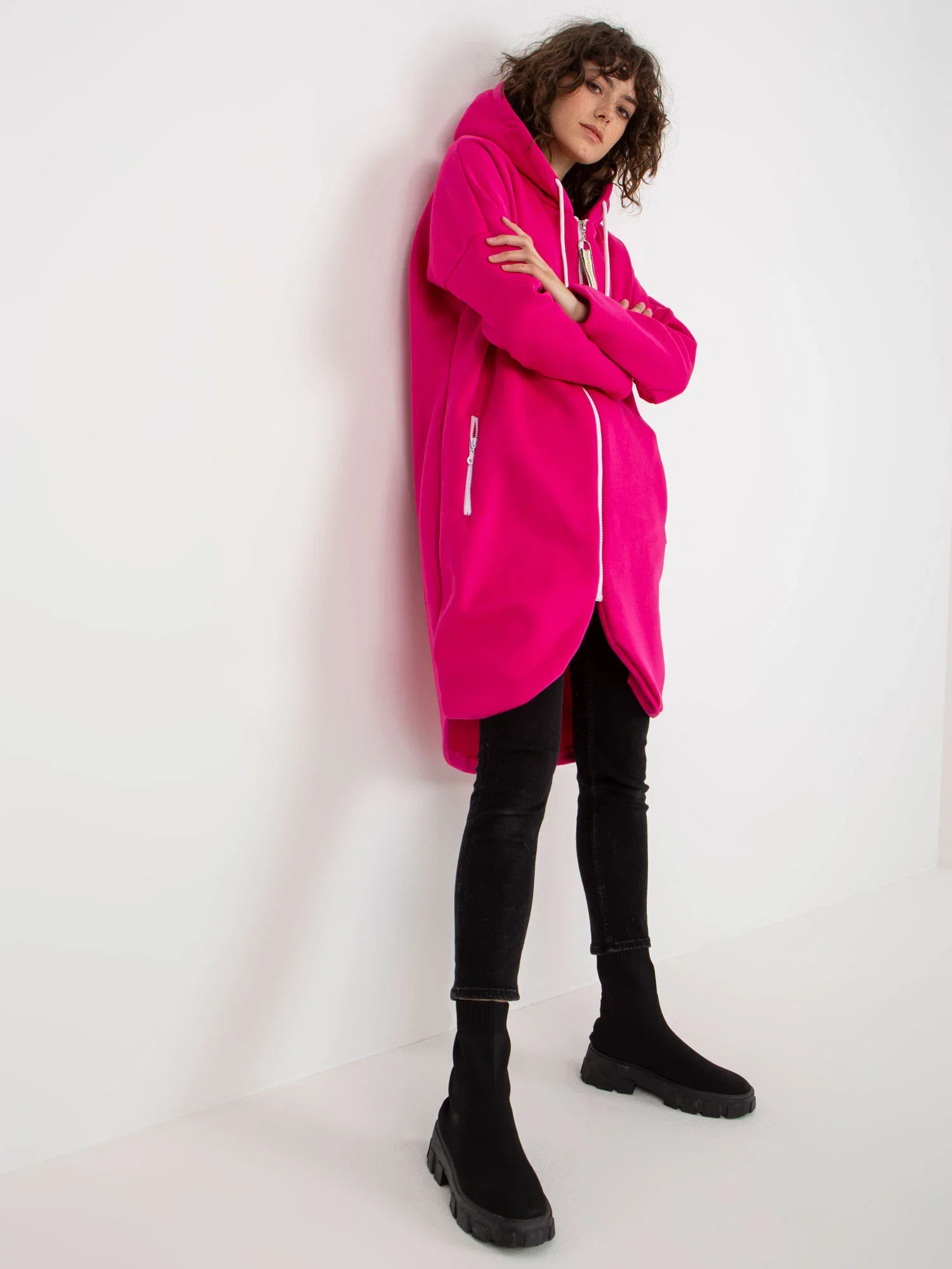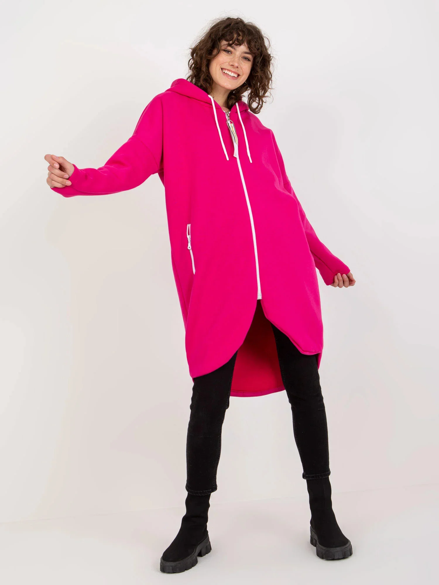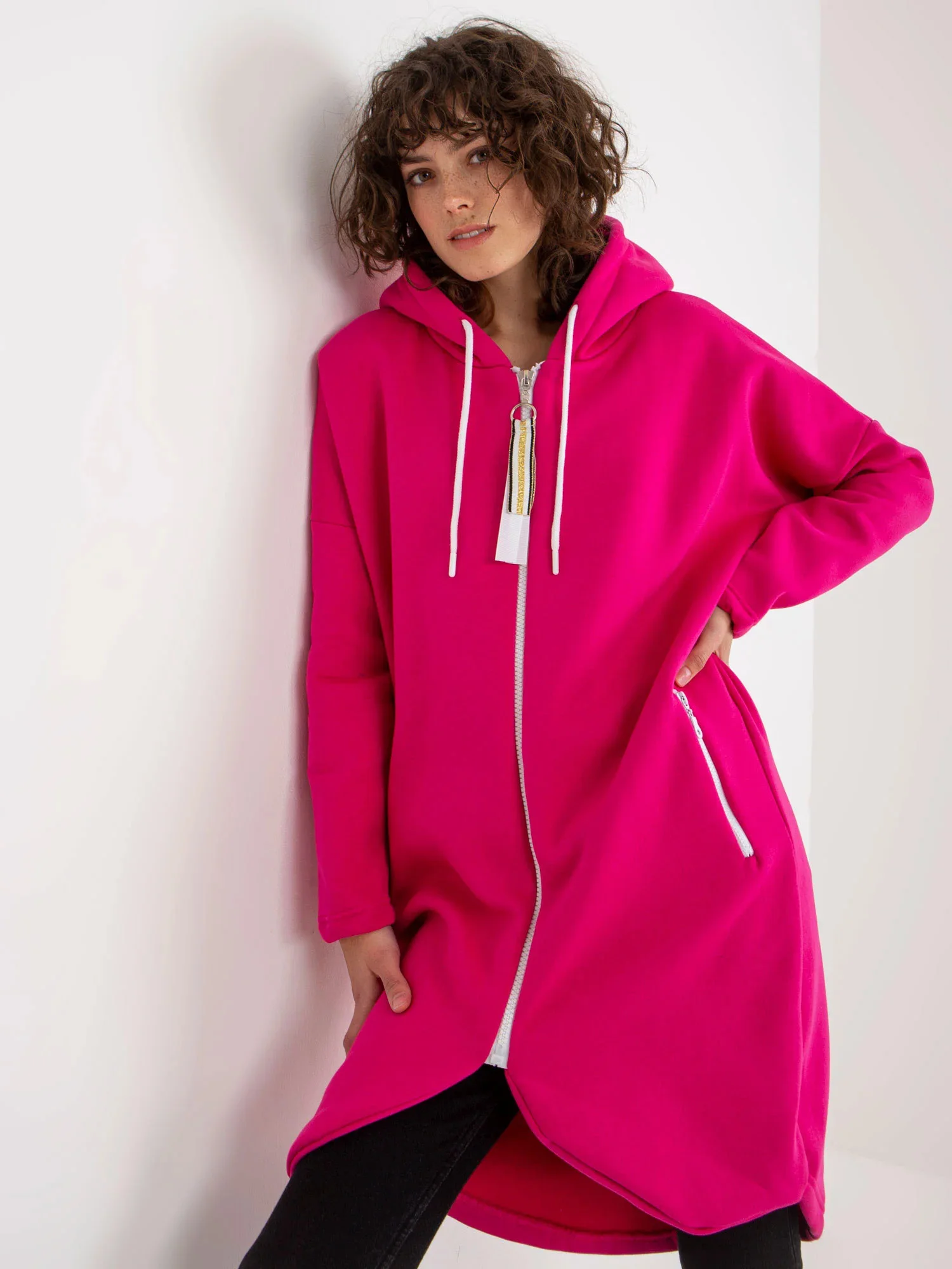 Fuchsiová dlouhá mikina s kapucí.
