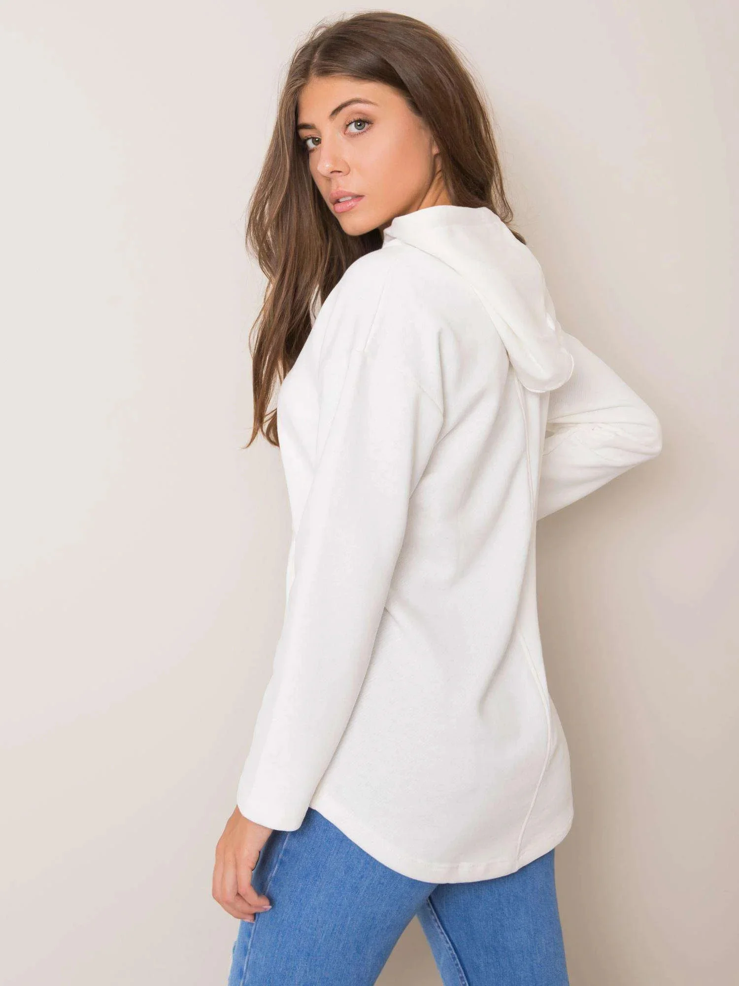 Mikina klokanka s kapucí v barvě ecru.