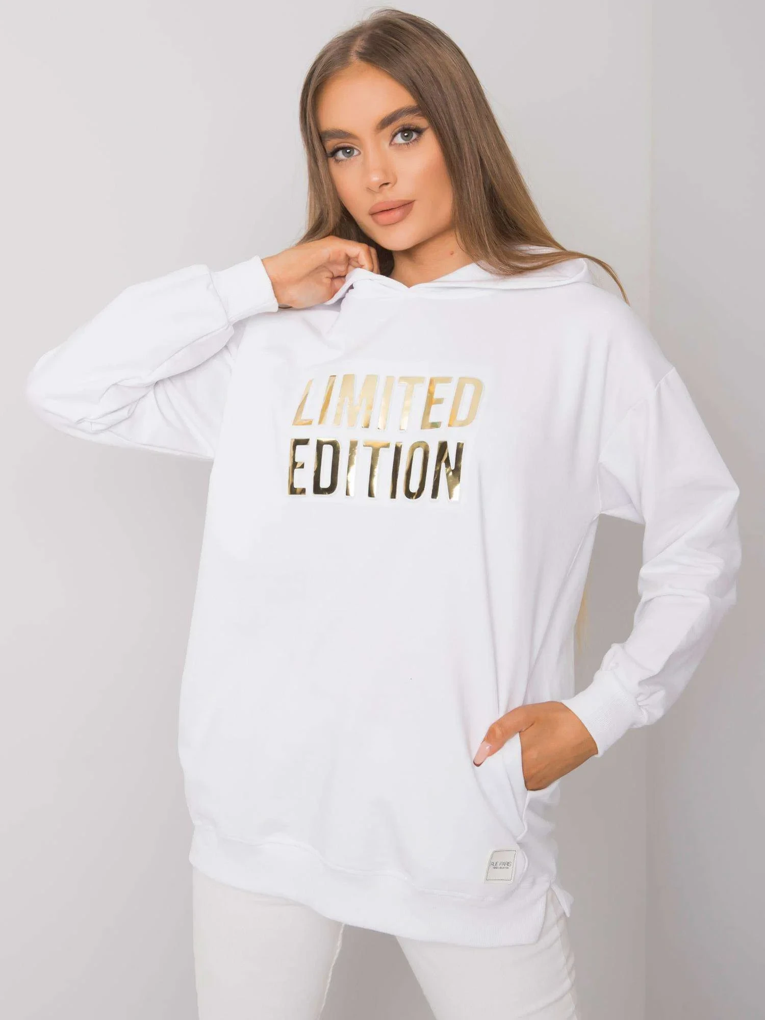 RUE PARIS Bílá mikina s kapucí a kapsami.