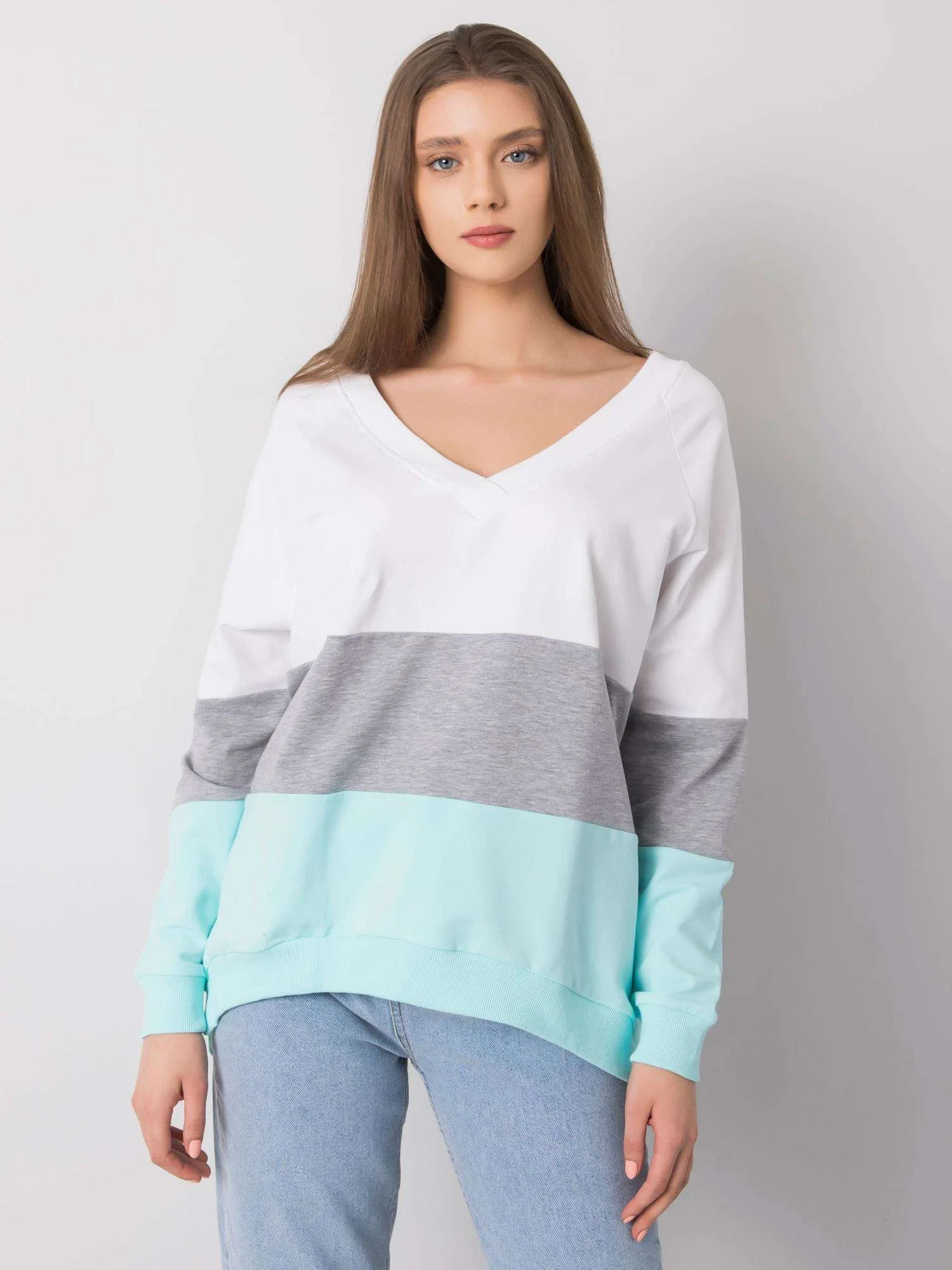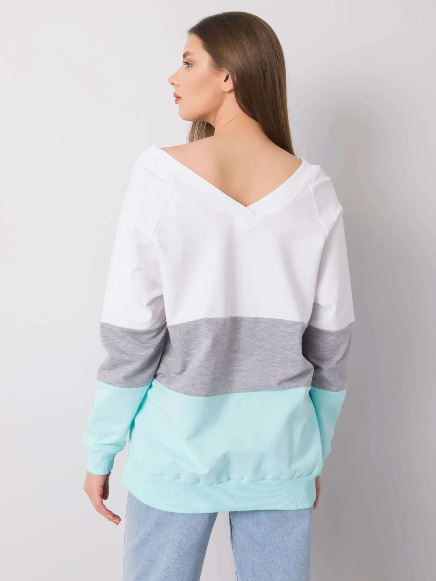 RUE PARIS Bílá a mátová mikina s výstřihem do V.