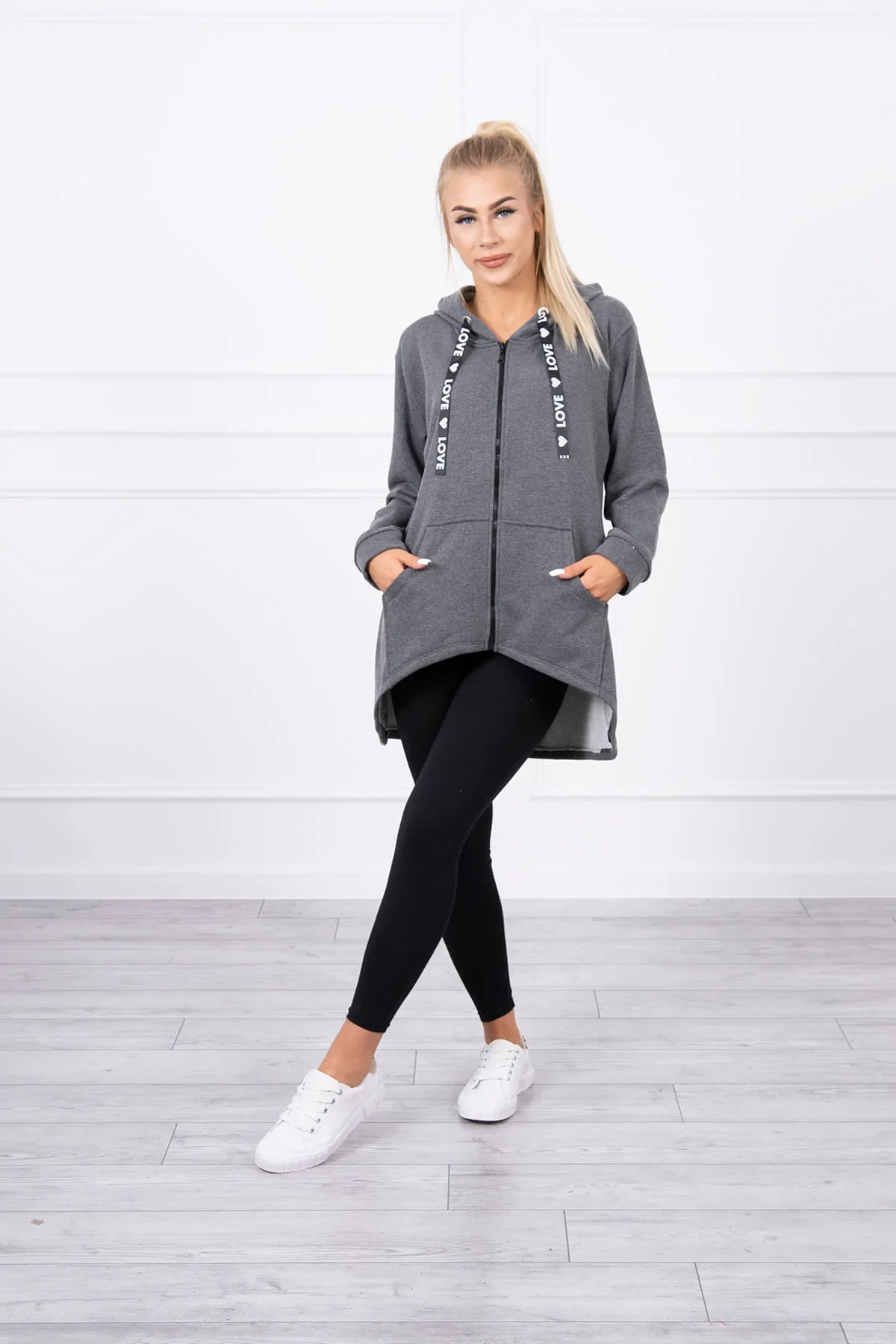Představujeme vám mikinu s delšími zády a kapucí. Mikina má zapínání na zip a kapsy na přední straně. Díky silnějšímu materiálu je ideální pro chladnější večery nebo podzimní dny. Mikina je vyrobena z vysoce kvalitního materiálu. Velikost je univerzální a vyhovuje dámám, které nosí velikost S, M nebo L.
