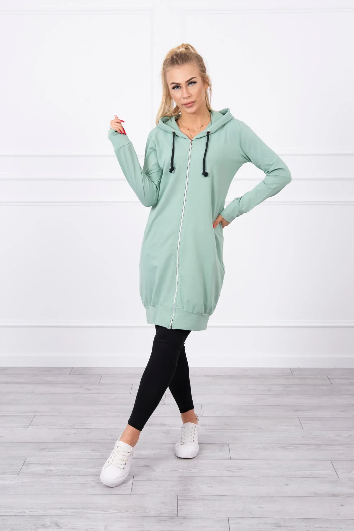 Představujeme vám pohodlnou dlouhou mikinu s kapucí. Mikina má zapínání na zip. Mikina je vyrobena z vysoce kvalitního materiálu. Velikost je univerzální a vyhovuje dámám, které nosí velikost S, M nebo L.
