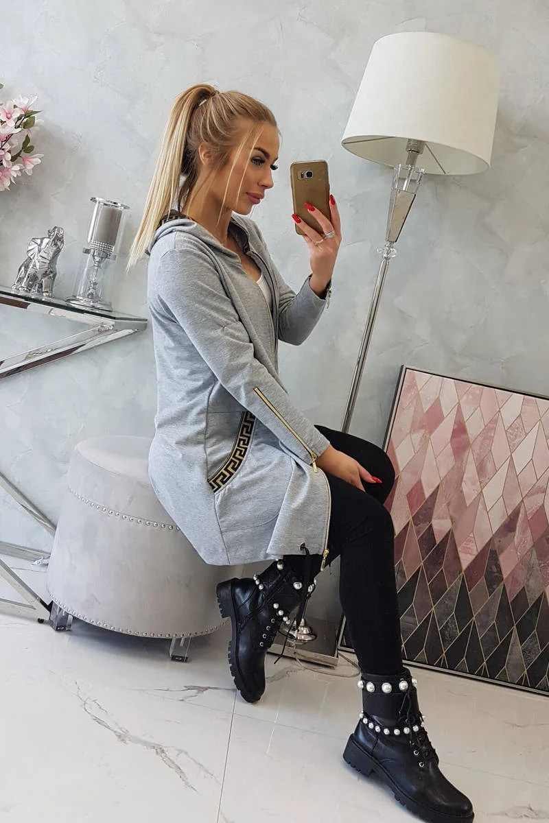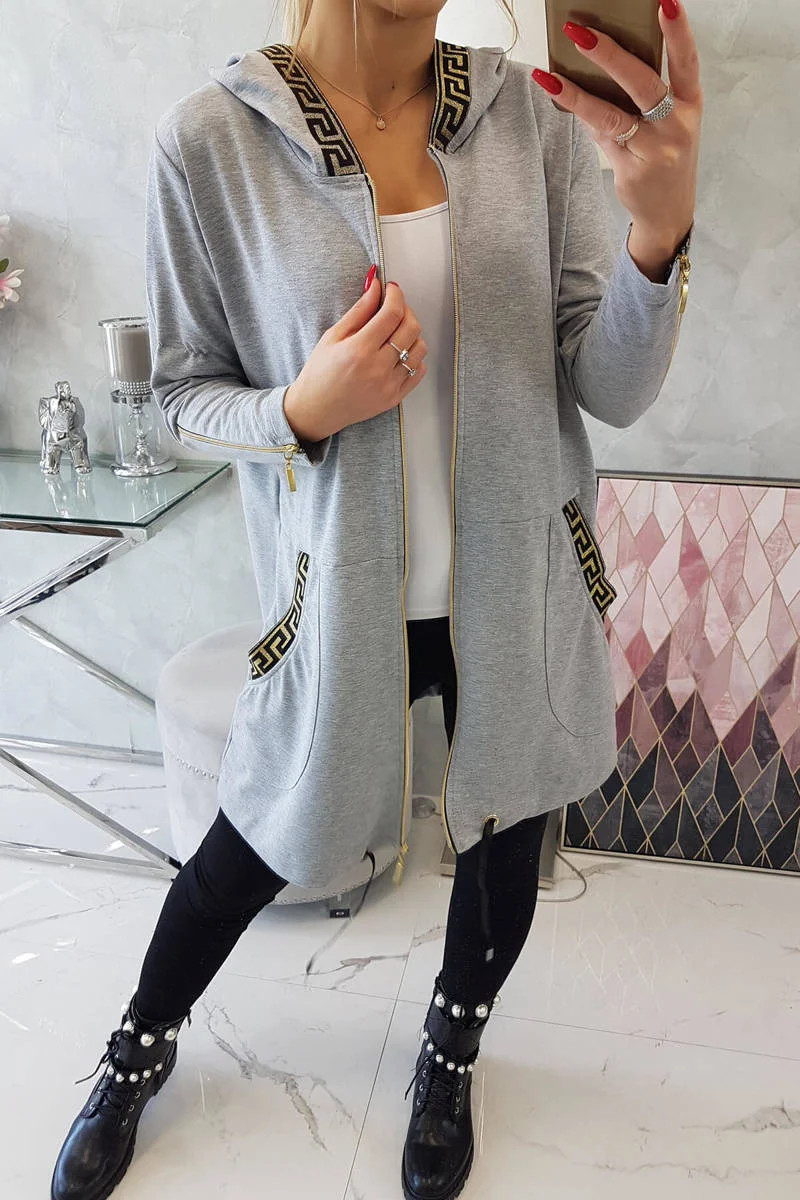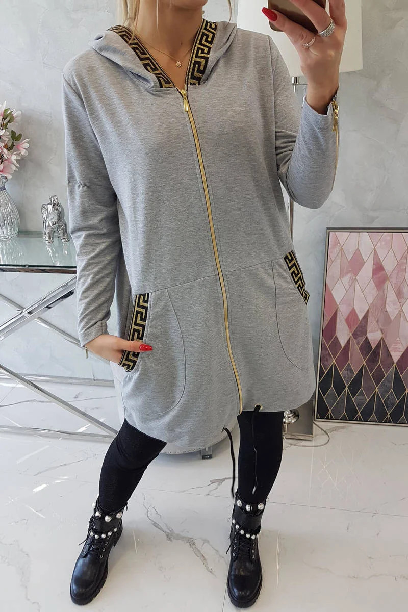 Představujeme vám pohodlnou dlouhou mikinu s kapucí. Mikina má zapínání na zip a ozdobné stuhy na kapsách a kapuci. Mikina je vyrobena z vysoce kvalitního materiálu. Velikost je univerzální a vyhovuje dámám, které nosí velikost S, M nebo L.