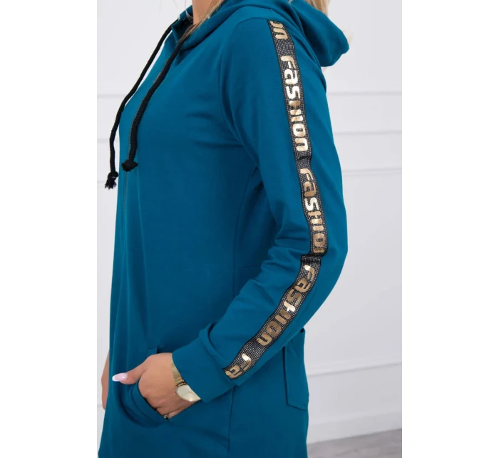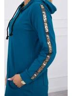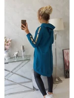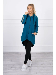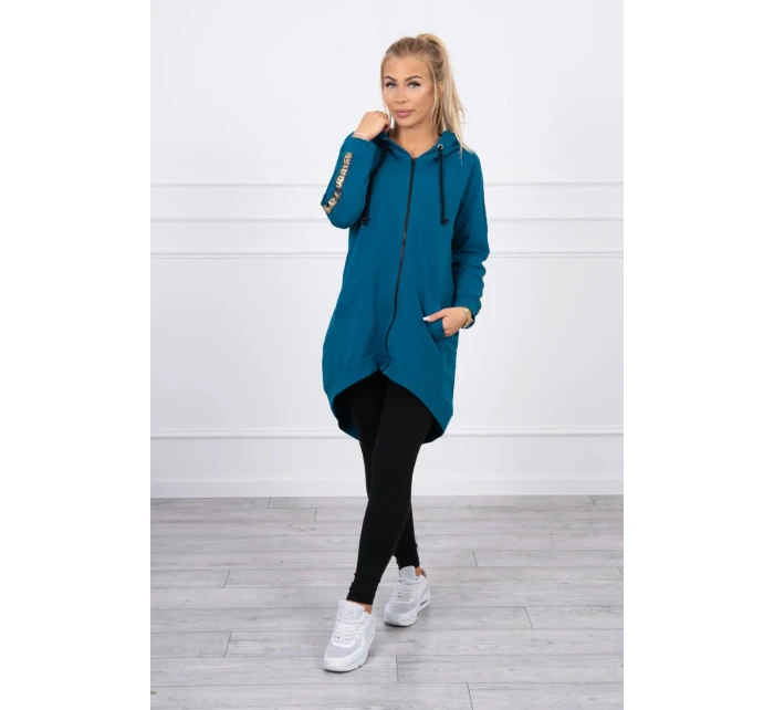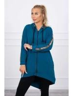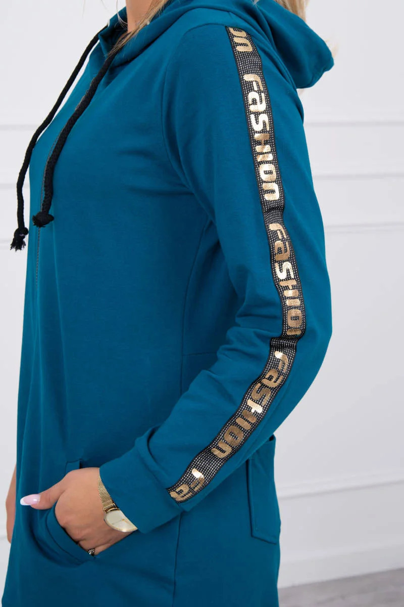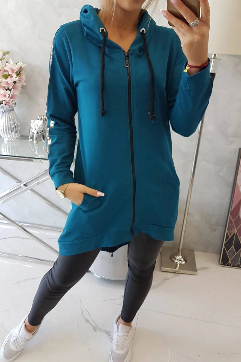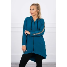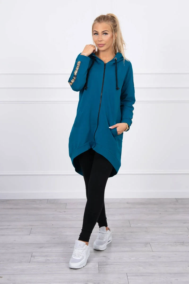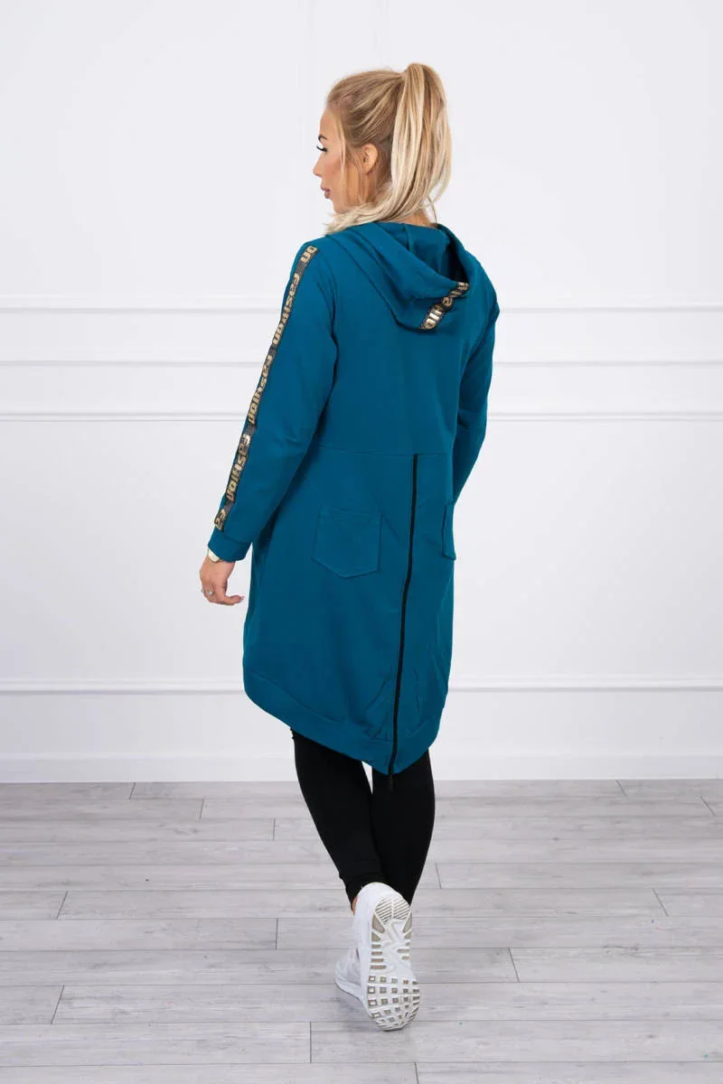 Prezentujemy Państwu wygodną długą bluzę z kapturem. Bluza posiada zapięcie na suwak oraz dodatkowo suwak z tyłu. Kieszenie z boku oraz dwie ozdobe z tyłu. Bluza posiada naszyte taśmy z napisem fashion. Bluza wykonana jest z wysokiej jakości materiału. Rozmiar jest uniwersalny i będzie odpowiedni dla Pań noszących rozmiar S, M lub L.