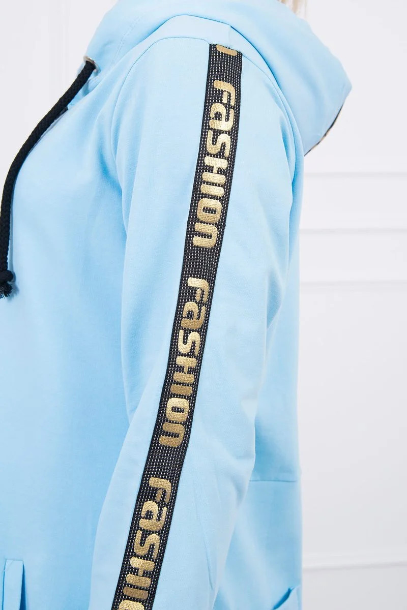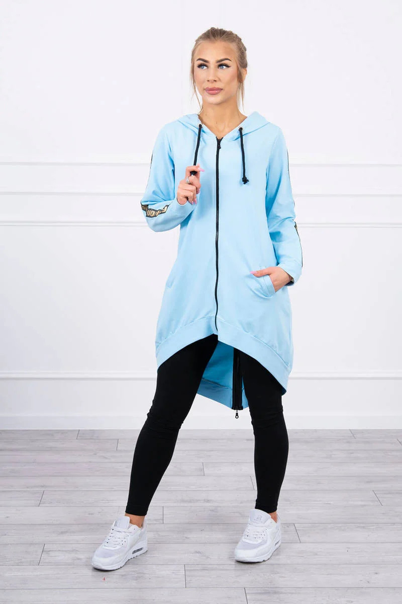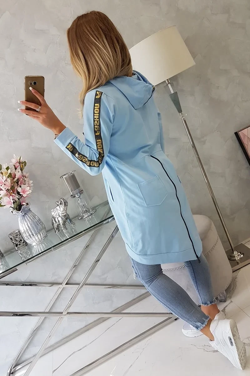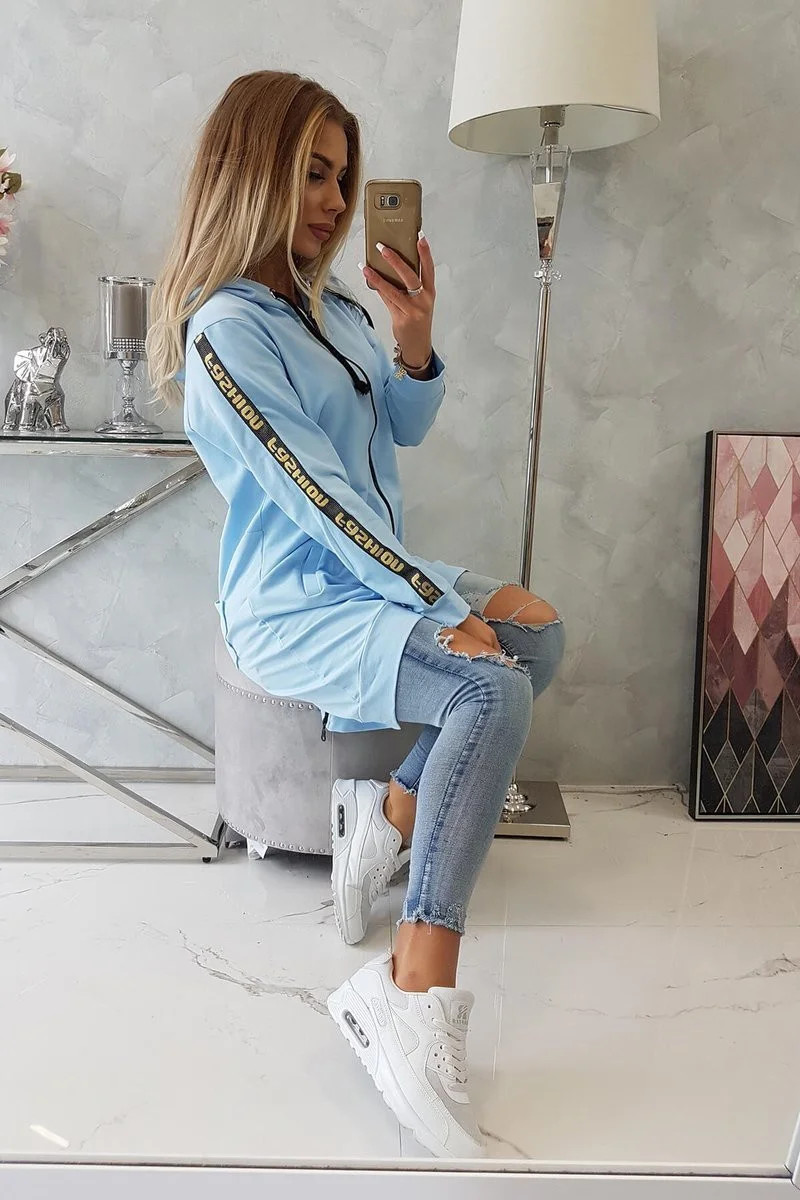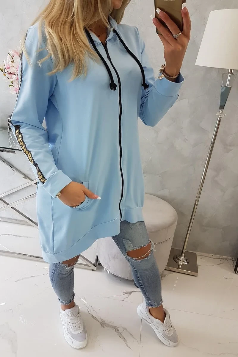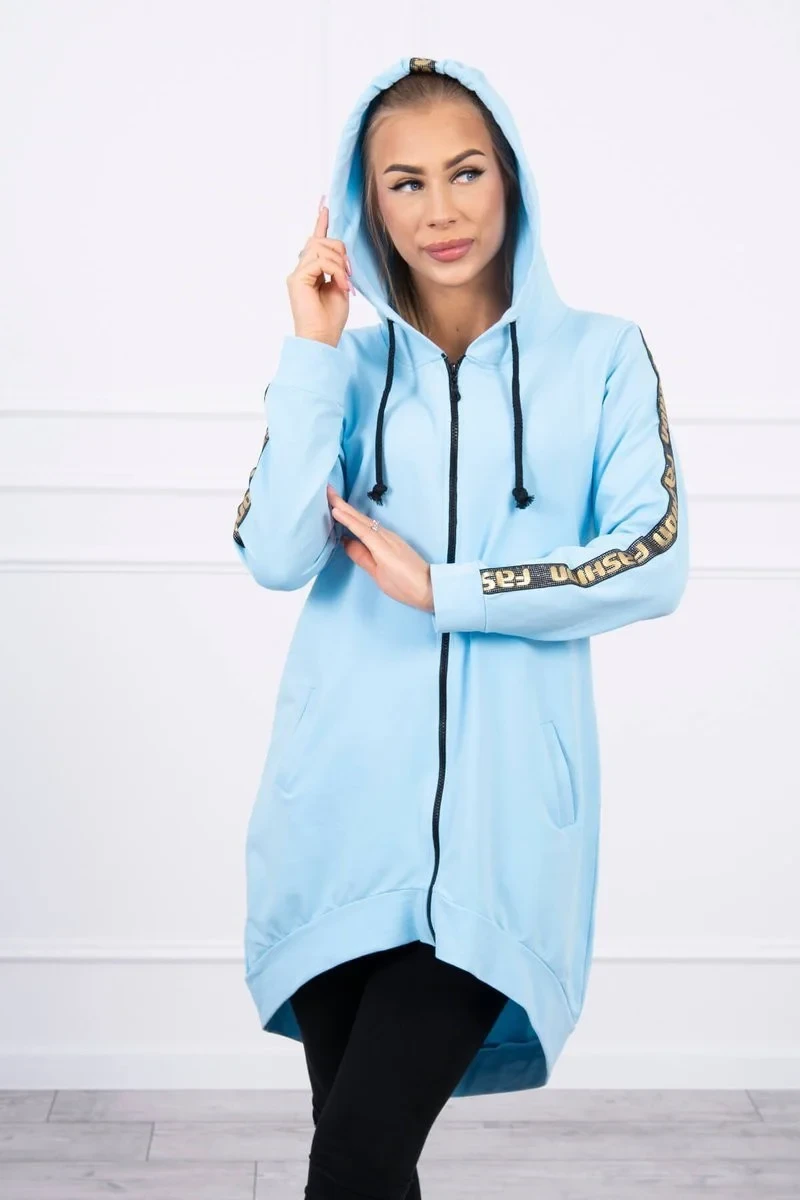 Představujeme vám pohodlnou dlouhou mikinu s kapucí. Mikina má zapínání na zip a další zip na zádech. Kapsy na bocích a dvě ozdoby na zadní straně. Mikina má našité stuhy s nápisem fashion. Mikina je vyrobena z vysoce kvalitního materiálu. Velikost je univerzální a vyhovuje dámám, které nosí velikost S, M nebo L.