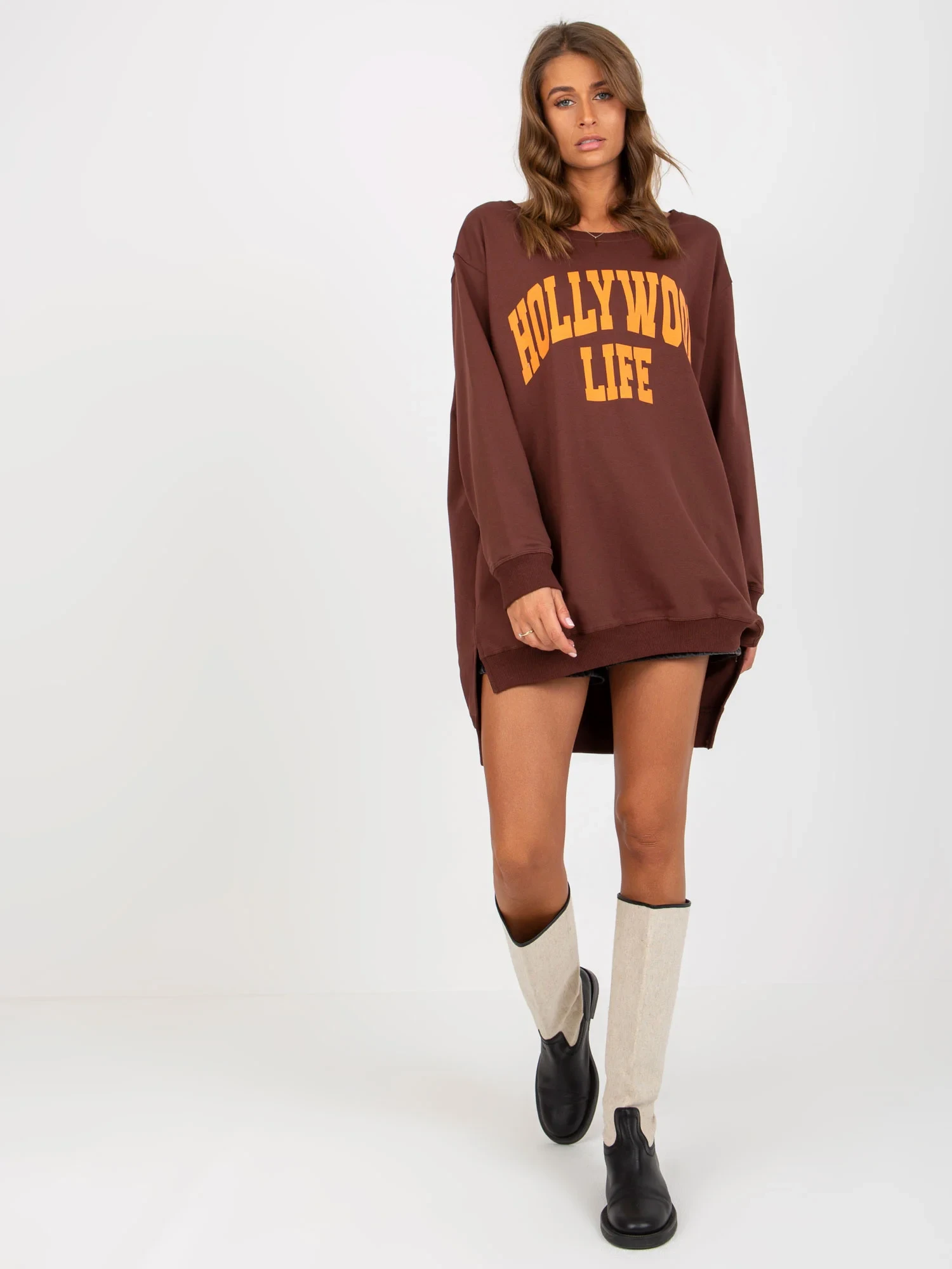Tmavě hnědá a oranžová dlouhá mikina oversize s nápisy .