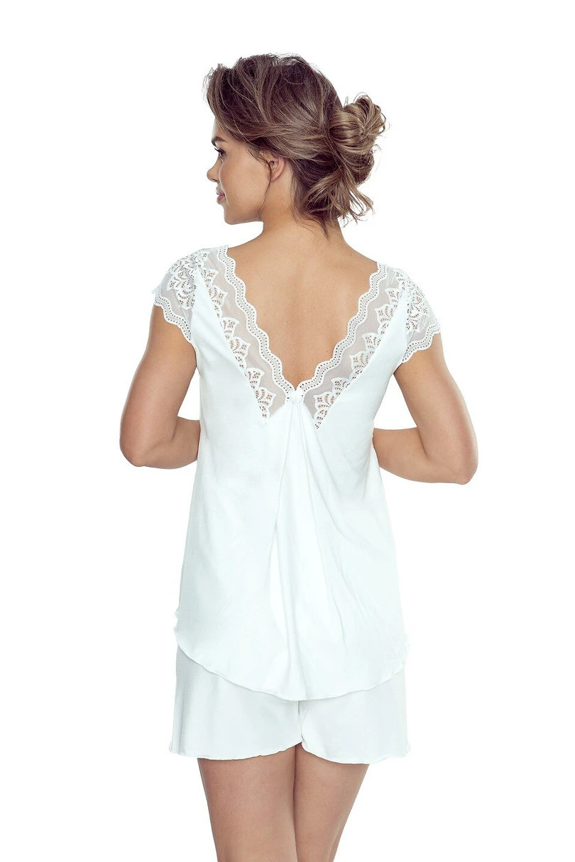 Poczuj komfort i kobiecość dzięki letniej piżamie damskiej z wysokogatunkowej wiskozy. Komplet składa się z rozkloszowanej koszulki z krótkim, koronkowym rękawem typu motylek oraz wygodnych szortów na elastycznej gumce. Głęboki dekolt i plecy w kształcie litery „V” ozdobione delikatną koronką podkreślają subtelną elegancję. Dzięki elastycznej gumce pod biustem oraz przewiewnemu materiałowi, piżama doskonale dopasowuje się do sylwetki, zapewniając swobodę ruchów i maksymalny komfort snu. Idealna na ciepłe noce – stylowa i praktyczna.