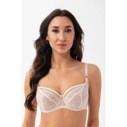 Biustonosz miękki przeznaczony dla kobiet ze średnim i dużym biustem, efekt uniesienia i zebrania biustu do środka, 3-częściowe miski wykonane ze stabilnej koronki na tiulu stabilnym. Górna krawędź miski wykończona szeroką taśmą. Tył z transparentnej lycry zapewniającej bardzo dobre dopasowanie i podtrzymanie. Fiszbiny boczne zapobiegające zwijaniu się materiału. W zależności od rozmiaru dwu lub trzyrzędowa haftka z trójstopniową regulacją obwodu. Nieodpinane, regulowane ramiączka w trzech szerokościach, w większych rozmiarach dodatkowo wzmocnione welurową taśmą. Metalowe elementy w kolorze jasnego złota (nie zawierają niklu)