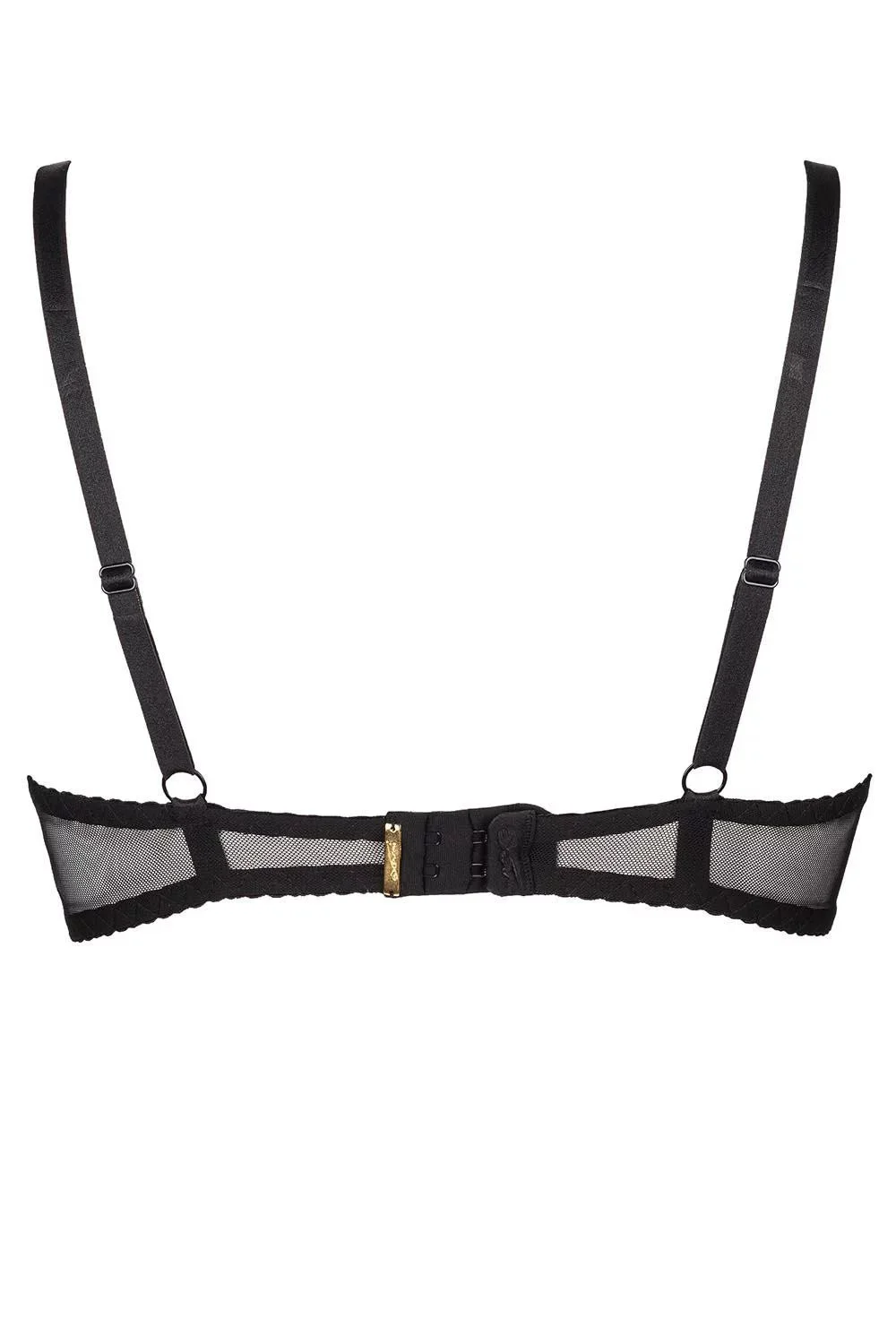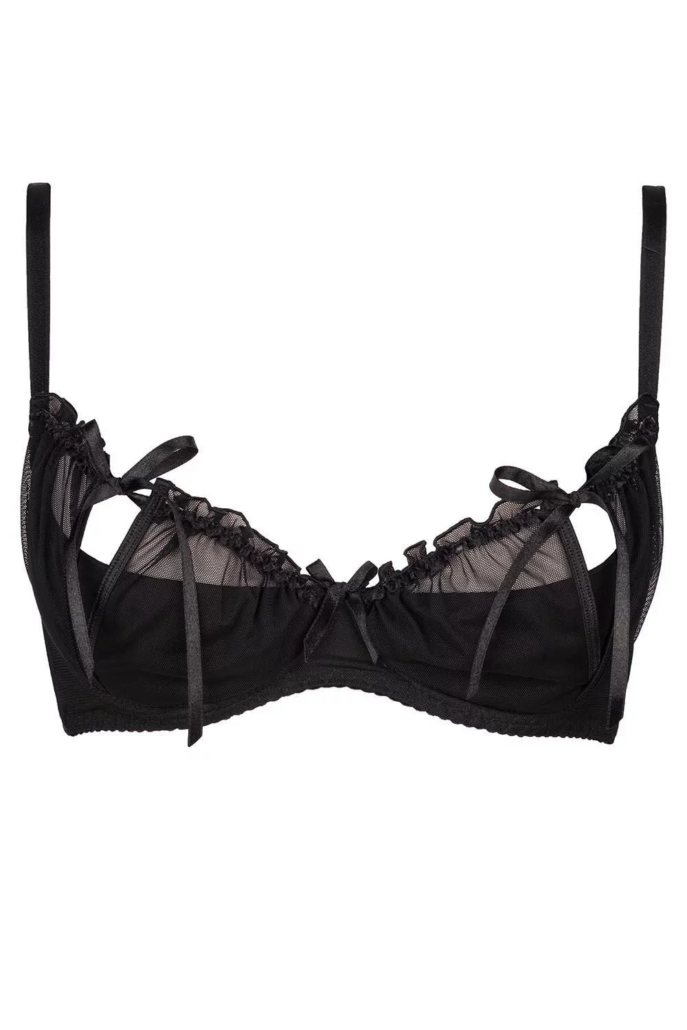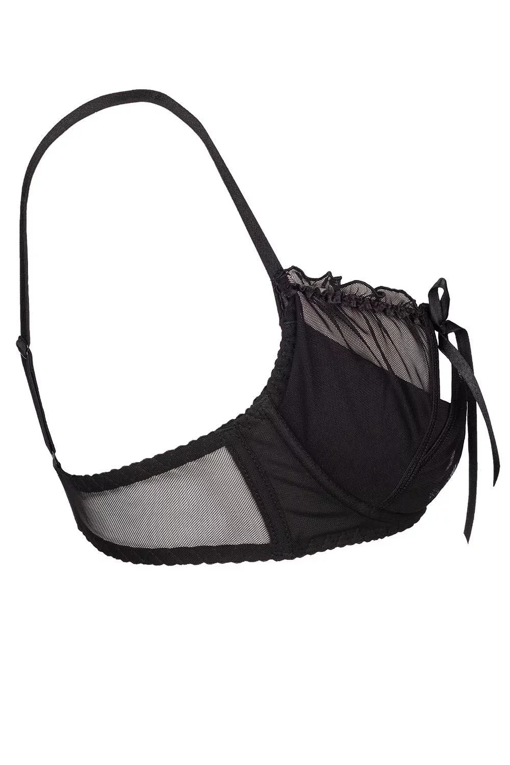 Smyslná černá polopodprsenka Charbon se svůdným vykrojením košíčků.Podprsenka je vyrobená z jemné tylové síťovinky, díky které ještě více vynikne vaše ženskost!Hravé mašličky a vlnovky dodávají na kráse celému modelu, který je doplněný o svislé kostice. Ramínka jsou nastavitelná a nelze je odepnout. Zapínání podprsenky je na dva háčky s možností třístupňového nastavení obvodu.Komplet vytvoříte s podvazkovým pásem a kalhotkami typu string Charbon.