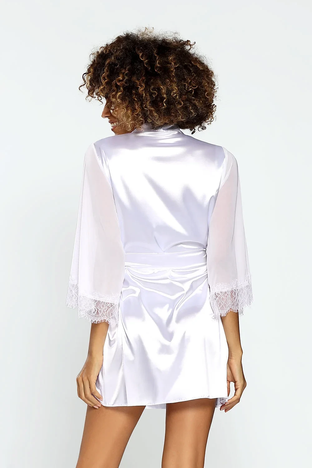 Bílý saténový župan s tylem a krajkovými rukávy. Elegantní a smyslné, určitě v nich budete vypadat skvěle. Rukávy jsou mírně volnější, a'la kimono, v módní délce 7/8. Tyl je na zápěstích krásně zakončen krajkou. Přiloženým páskem zvýrazníte svůj pas. Složení: 100% polyester.