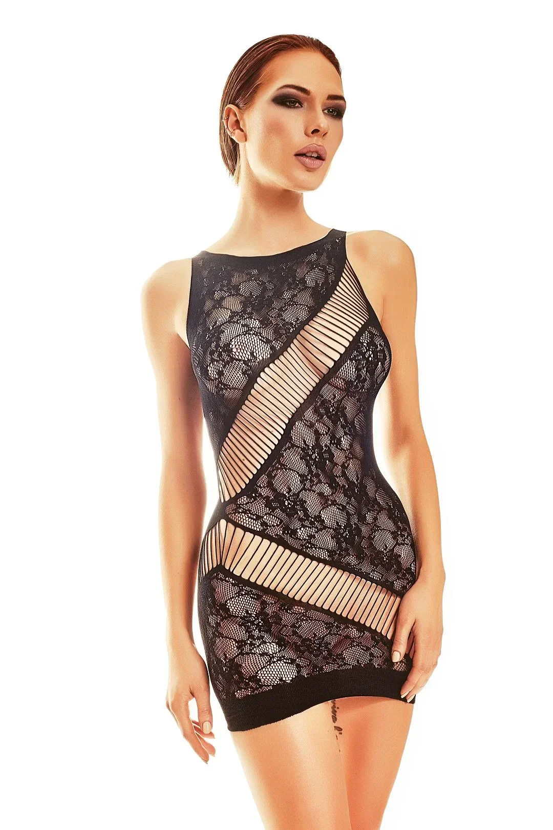Smyslné černé přiléhavé šaty z elastické příze. Mírně průsvitný model s prasklinami, které dále zdobí tělo, s jemným květinovým vzorem a'la lace. Šaty jistě zvýší teplotu pocitů ve vaší ložnici. Složení: 80 % polyamid, 20 % elastan.