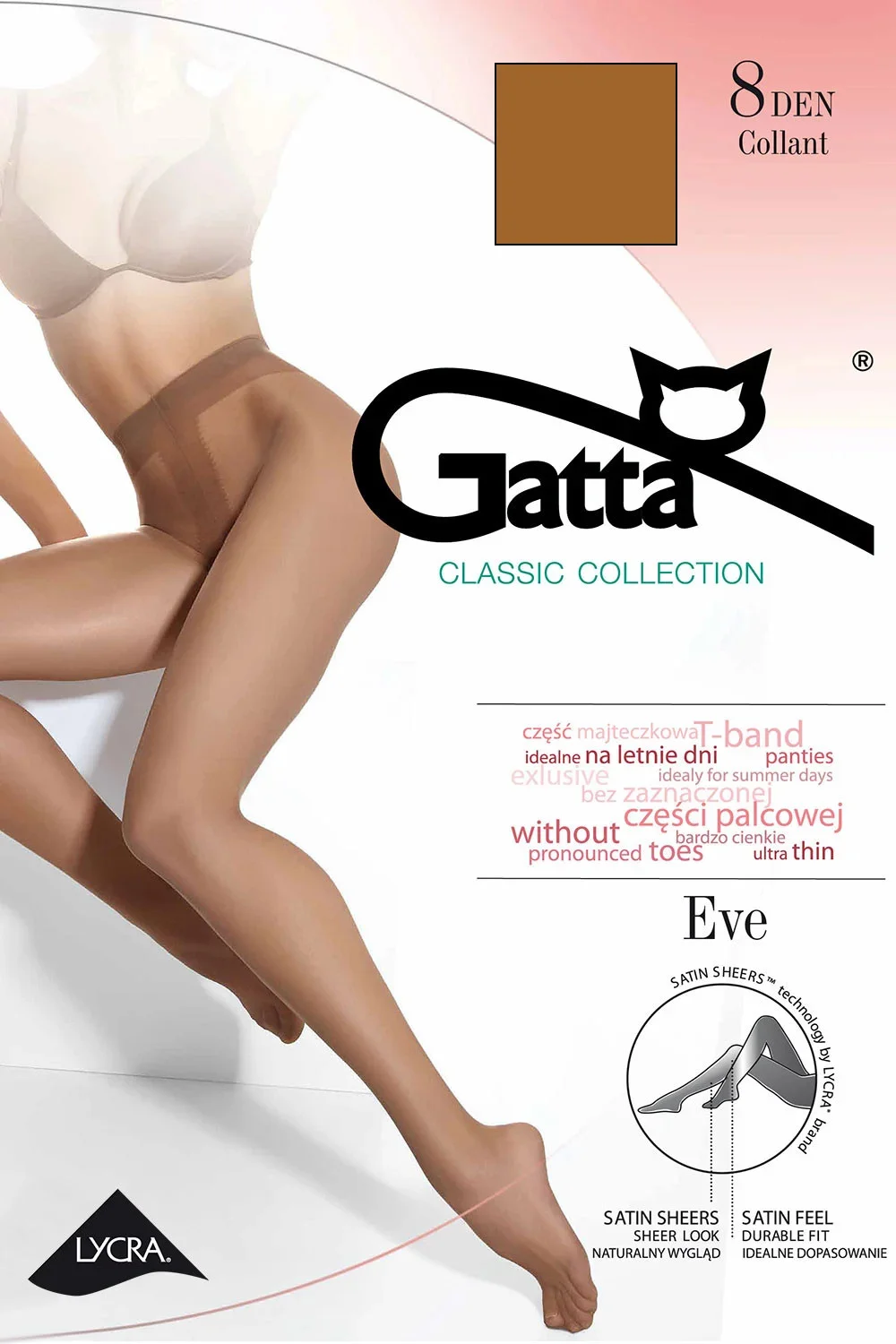 Punčochové zboží značky Gatta. Model EVE. Výrobek je vyroben z 85 % z polyamidu a 15 % z elastanu. Výrobek pro ženy.