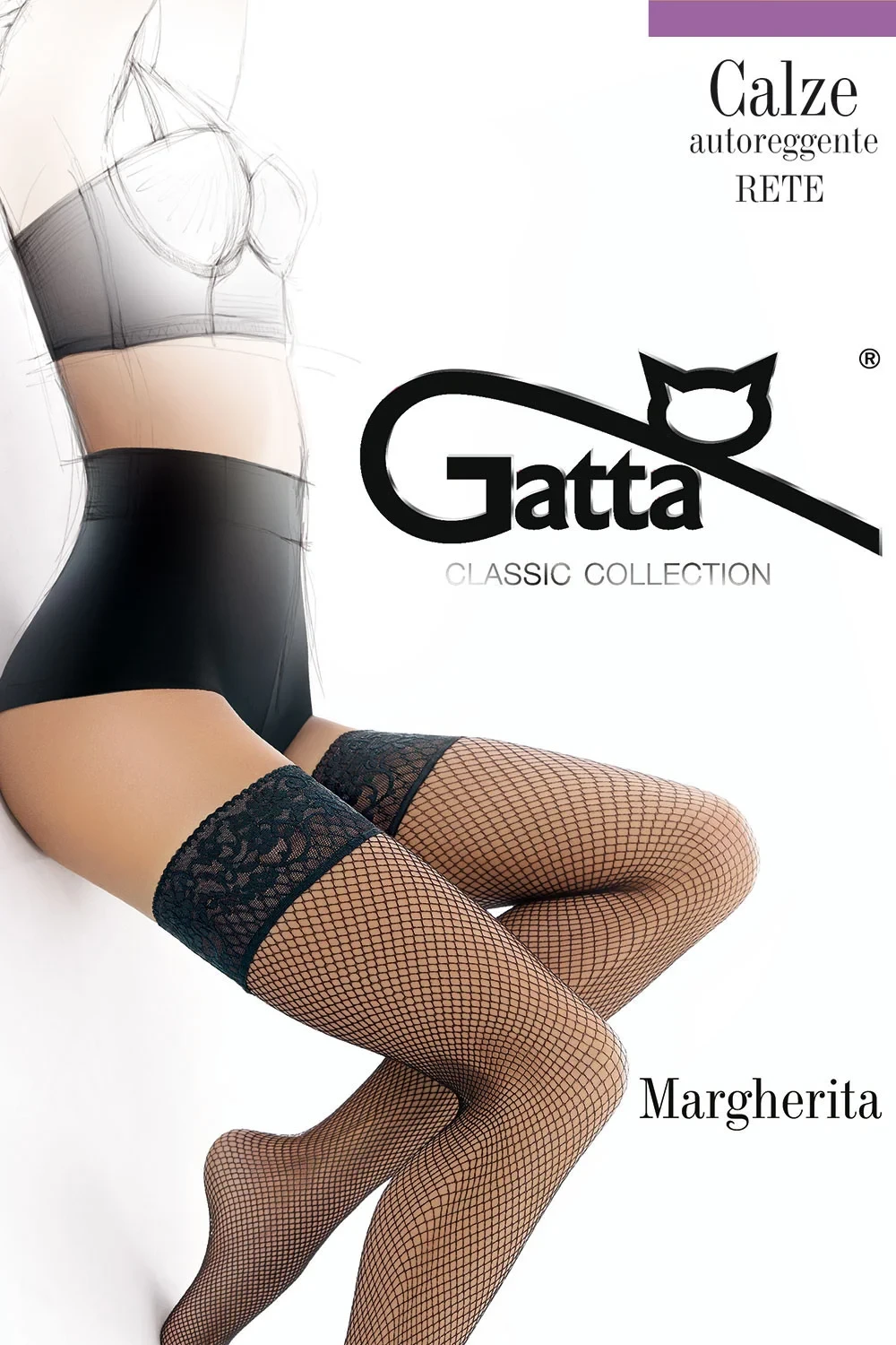 Punčochové zboží značky Gatta. Margherita 01 model. Výrobek je vyroben z 82 % z polyamidu a 18 % z lycry. Výrobek pro ženy. Vlastnosti produktu: sexy kabaret s krajkou samodržící. Žádné označené prsty. Obsahuje silikonovou podpůrnou pásku.